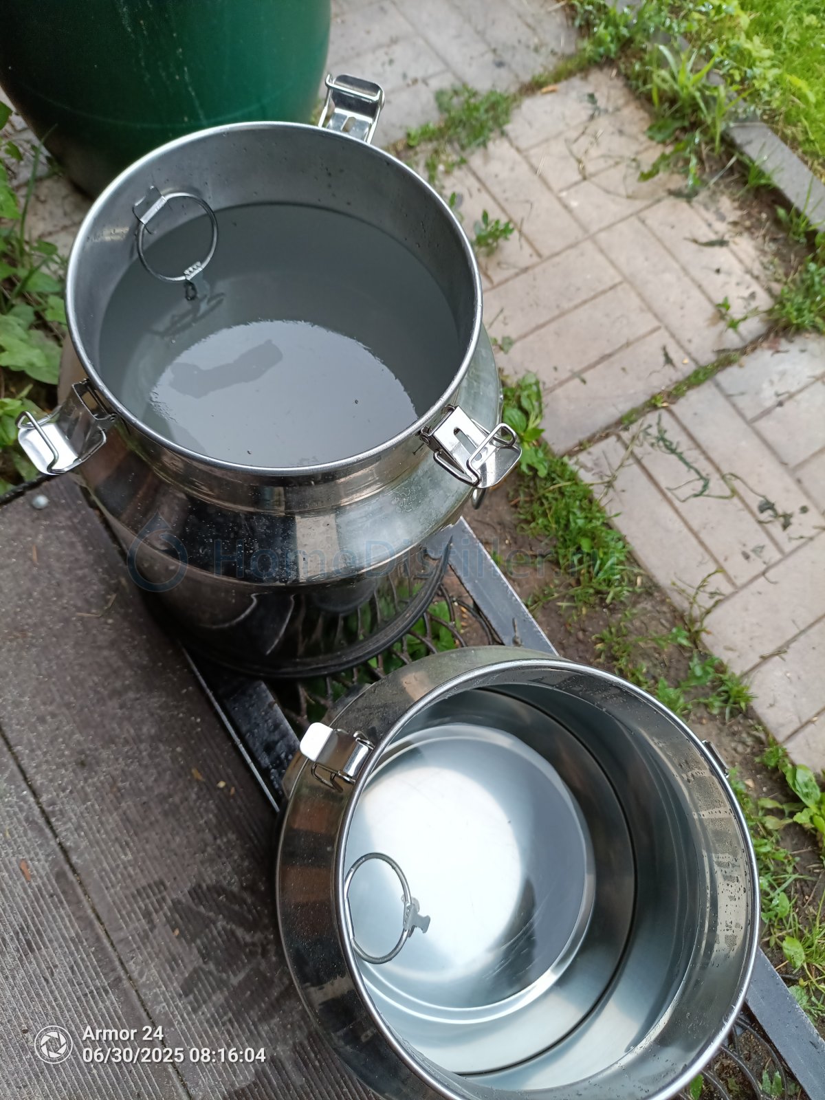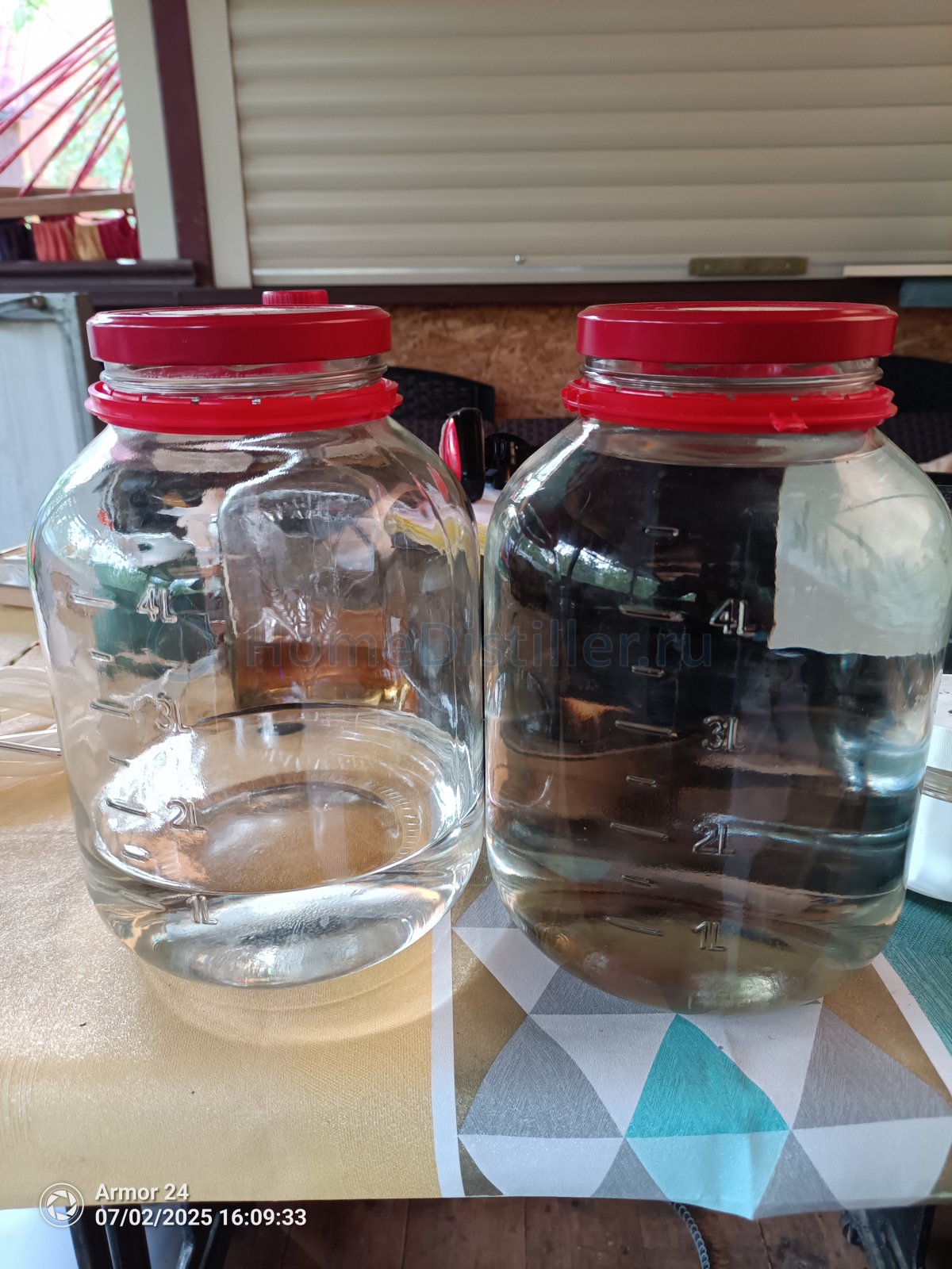 Головы на зерновых дистиллята х лучше отобрать до колпачков,в момент укрепления.Перегон для этого,разбавленный до 25-27 об.И спирт до второго перегона почистить,если нужно,механически.От жира.Какая тут религия?Точный физический расчет.Религия когда начинают Стабникова и Скурихина пришивать к кубовой перегонке на колпачках. Колонны в основном стоят в непрерывных установках,где спирт внизу всегда одной крепости.Мы попадаем в понятное-крепость навалки падает,спирта на тарелках,физически много нужно.Ну и начинается понятное.Убавляешь отбор,но спирта внизу просто нет,колонна работает в непростых условиях.Да ещё спирт с тарелок дожимать.Которого ,чем больше диаметр и выше,тем больше.Привет Домспирту!Не очень понятно,зачем люди покупают тарелки для промки.Для получения,блин,спирта.Лирическое отступление.Способов решения проблемы конца перегона несколько.Укрепление навалки до 60 об.Использование колонны(сборки) нужного диаметра и высоты под объем и спиртуозность, качества продукта.Использование МЦехи.Дробление погона после первого скачка температуры.Отправляю на финишное углевание,то что дожимаю с тарелок.Разбавляю до питьевой крепости,и углюю.напочь убирая хвосты.Качество навалки под колпачковой колонной и даёт результат хороший.Внизу фотки спирта сырца и спирта после чистки.Спирт с куки,жирный и мутный.Зерновая смесь,на зелёном солоде.Нафига это в перегон впихивать,под колпачки,не очень понятно.В дистилляции весь смысл в контроле спиртов между перегонами.Обьемы большие у меня,спирты разные.Разных зерновых миксов.И работаю с ними по разному.Но на колпачках в третьем перегоне,всегда крепкая навалка,без голов.Хоть на какой сборке,виде и высоте колонны.Это прям сейчас происходит.Температура в узле отбора по пару стоит как выкопанная,мощность 2,5 кВт,отбираю чуть больше 2 литров в час.Получу спирт по расчету АС в кубе.Только спиртуозность будет ниже-потери на хвосты и физические .При отборе 5/6 от АС,скакнет температура.И буду дожимать спирты в ручном режиме.