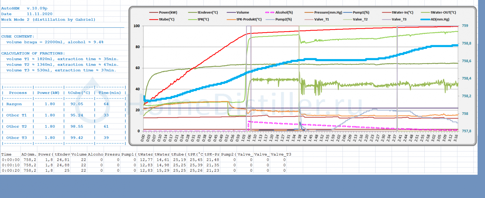 На этой диаграмме отображены все параметры используемые автоматикой, в том числе и "голубое" АД (выделил жирной линией, отсчет значений правая ось ординат). Брага от 11. Первый раз работаю с ректификационной колонной. . Вопросы ректификаторов. По его поведению легко понять, что при этом погоне, датчик АД во всю лентяйничал. Так как атмосфера была практически нормально-идеальной (около 758мм.рт.ст). Но ведь АД 740 и ниже таки не редкость. А бражку так хочется отжать по максимуму...