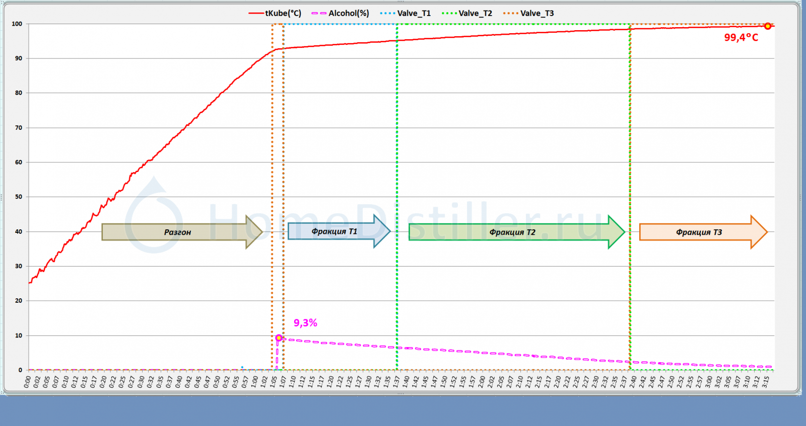 тупо объявляю автоматике, что процесс погона должен быть завершен при 99,5°С...