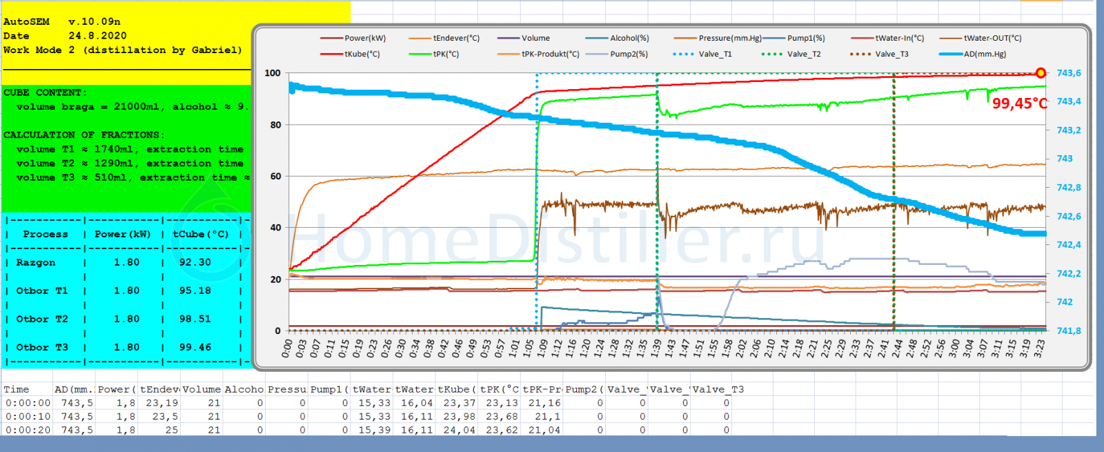 Итог предсказуем. Буду иметь большой объем слабоспиртуозного СС. Это если повезет и течение процесса буду контролировать. А если не буду то испарится в отбор все содержимое кубика, а 99,5°С автоматика так и не увидит...