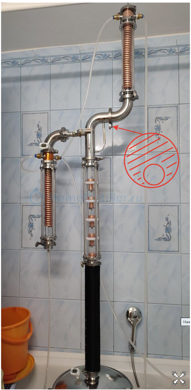 В царге нет отверстий. Но здесь уже намекнули, что отверстие на дефлегматор значительно больше, чем на холодильник. Это один из самых популярных узлов отбора по пару. Странно, как он у других самогонщиков работает.
