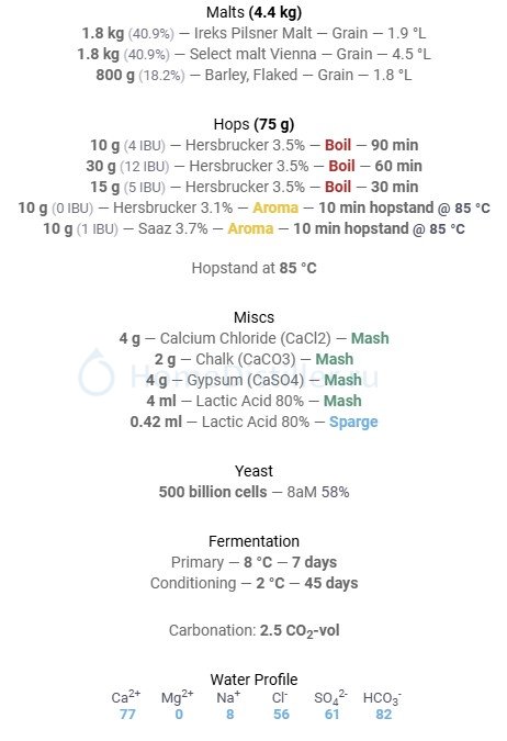 Через 7 дней брожения, пиво охлаждается до +4 °С и снимается с дрожжей. Дальше карбонизация праймером и лагеризация 21 день.
