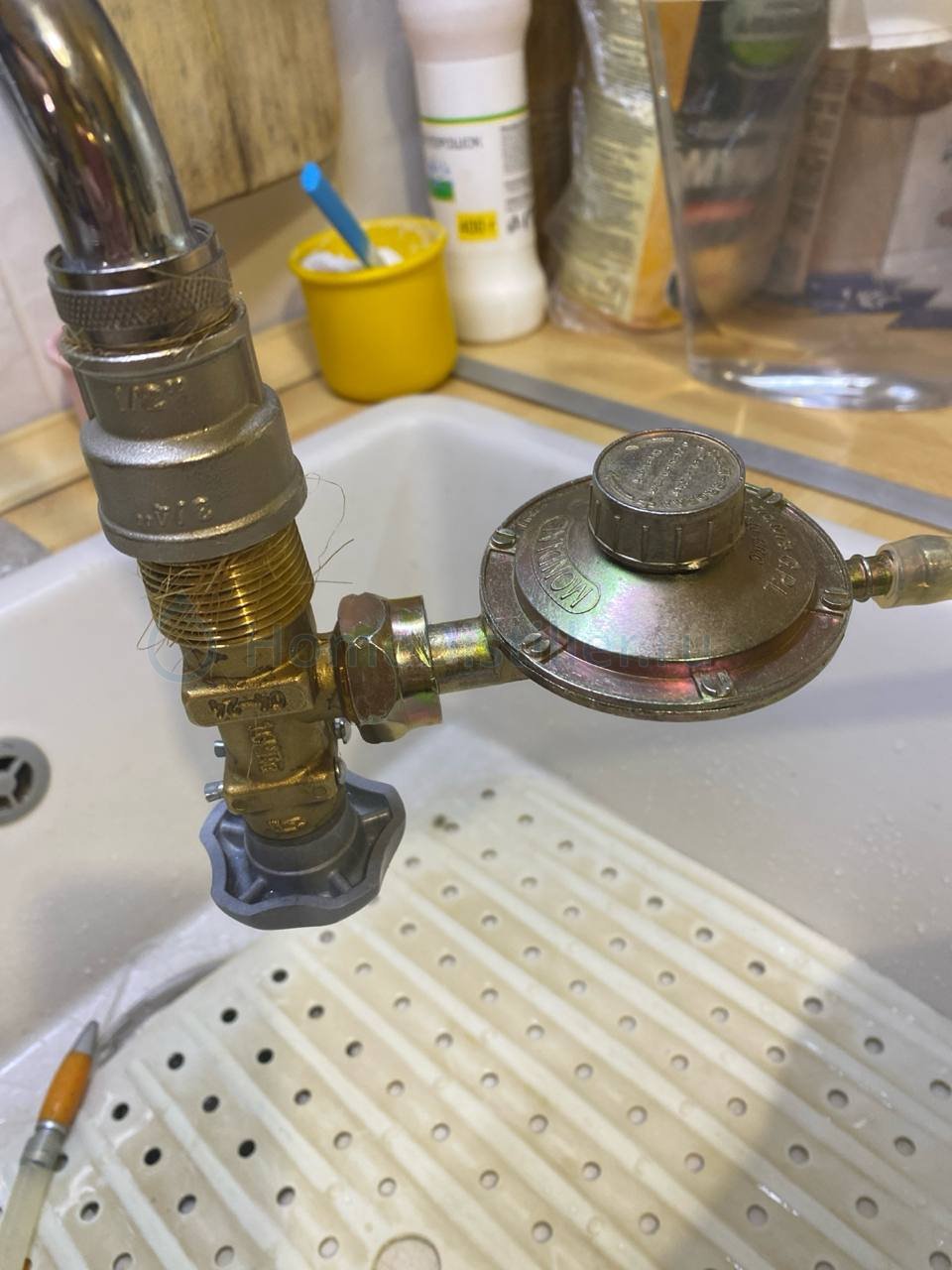 Вот такой регулятор сегодня испытал. Вентиль пропанового газового баллона с редуктором. И через переходники 3/4 на 1/2, а потом с 1/2 на М24 к водопроводному крану (гусаку) вместо рассекателя.