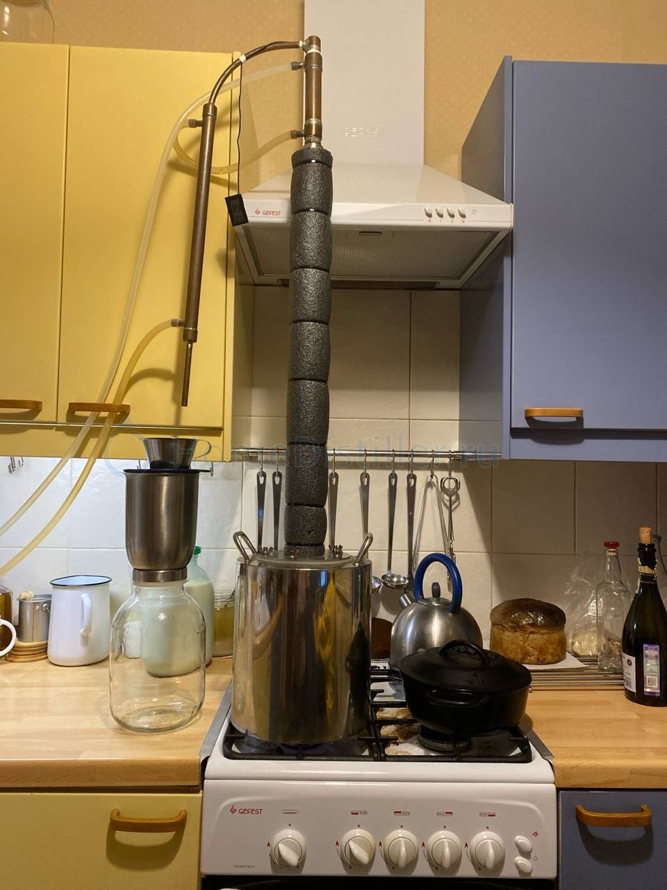 Миша, дело в том, что у меня отбор по пАру. Следовательно процесс регулируется напором охлаждения. Он должен быть стабильным, иначе температура будет скакать туда-сюда. И оператор вынужден дежурить рядом с колонной, что бы в нужный момент прикрутить или открутить кран охлаждения. Скачки давления в водопроводе постоянные, либо унитаз смыли, либо в ванной воду открыли, не говоря уже про то, что напор воды на входе в квартиру тоже нестабилен. Всё это сильно напрягает. А если напор охлаждения стабилен, то можно к колонне не подходить, ну, либо подходить раз в пол часа для контроля. Посмотри, как всё устроено.