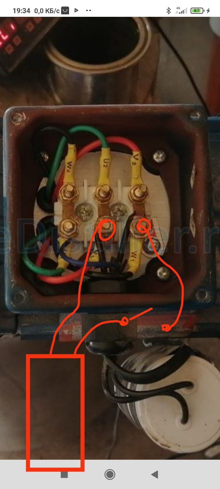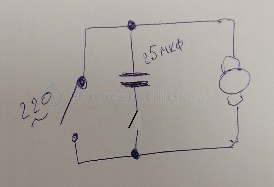 ГераSим, Фигассе ты схему нарисовал! По такой пробки на подстанции выбьет. Кондер тот. Но можно вдвое дешевле найти. Не суть. Вот твой клемник. Плохо видно но похоже штатный кондер подключён на средний и правый. Туда же и пусковой, только через кнопку на пару тройку секунд. Ну 5. Моторчик должен немного зарычать и раскрутиться. Искра может быть приличная. Как повезёт. Это нормально. IMG_20251024_193605. Мешалка в кубе. Вопросы самогонщиков. Кстати что там на штатном написано?