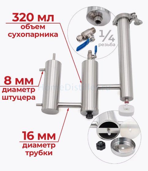 В его аппарате сухопарник стоит отдельно от куба и имеет кран для слива дерьма, а не НАД кубом в верхней части паропровода, где все сливается в куб.