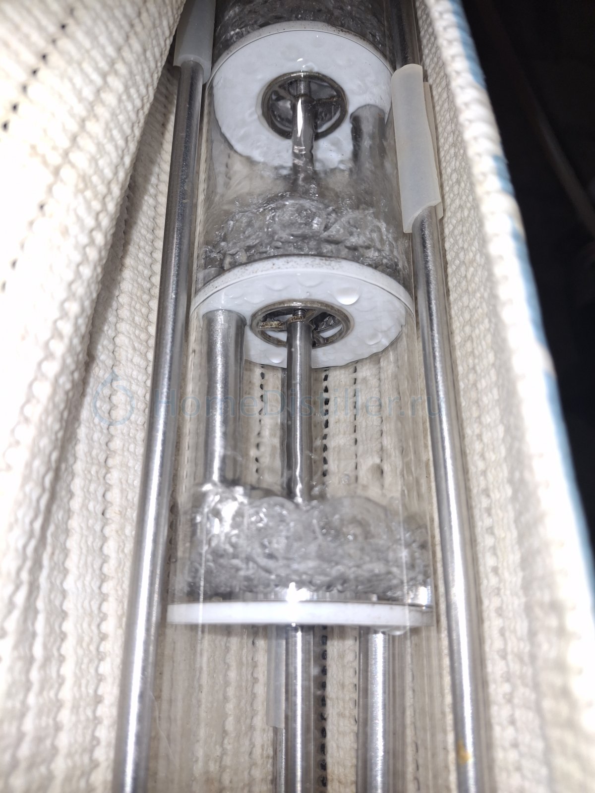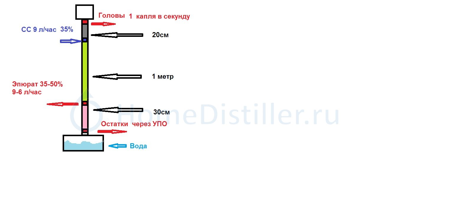 Мой ДП сказал, пора отбирать тело. Вот оно здесь и сейчас отбирается и я уверен, что спирт получится отличный. Внизу 30 ФТ, вверху ЦП с насадкой, высота конструкции под 4м. Давление в кубе 20 мм.рт.ст, барботаж на ФТ примерно 30% по высоте от межтарелочного расстояния.