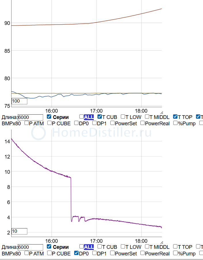 Здесь и сейчас графики, внизу проводимость тела, вверху температуры, куба, ДЕФа и в точке отбора тела. Отбор начал в 16:45 примерно.