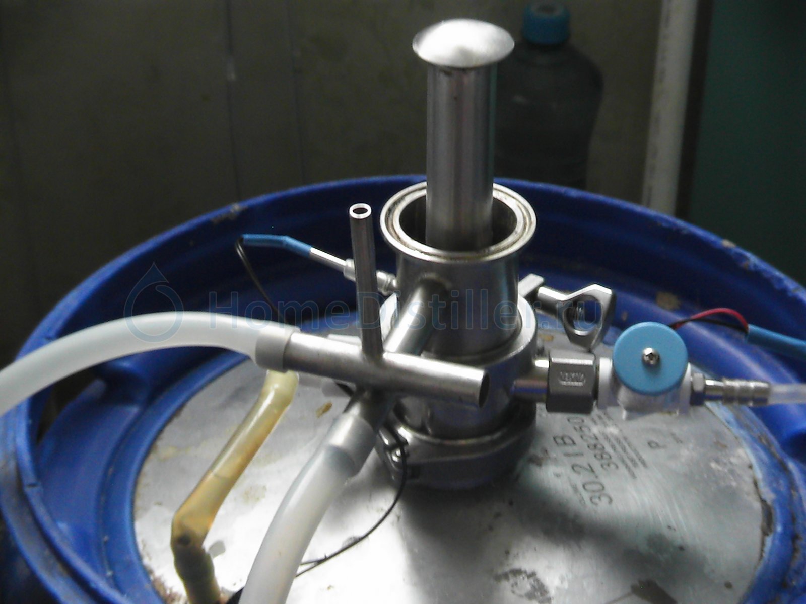 вчера гнал парогеном с подоревом воды в самом парогене. парогенератор (он же куб) кега-балтика 30л. горло родное, поставил на горло димрот спиралью внутрь, сверху узел отвода барды и сама нбк, на входе в змеевик эл.клапан, выход в куб (использовал штуцер манометра, манометр не подключал), уровень регулирует поплавок (выше писАл, за него), он включает цикл. таймер, таймер подаёт напругу на клапан только когда уровень воды упадёт,( если напрямую, клапан будет колбасить от каждого шевеления поплавка) и воду подаёт импульсами, а не льёт пока уровень не поднимется, воду подавал параллельно с охлаждением через тройник одна ветка на охлаждение, вторая на подпитку. работает.
