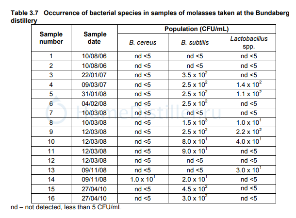 Из резервуаров для хранения мелассы последовательно выделяли два вида дрожжей с низкой концентрацией (приблизительно 10 3 КОЕ/мл). Они были идентифицированы как Saccharomyces cerevisiae и Schizosaccharomyces pombe. Эти виды перенесены в резервуар для подачи патоки, но не были выделены из приготовление патоки после осветления и переливания в первый расширительный бак.