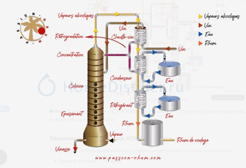 Технические требования AOC Martinique По правилам аппелласьона колонна должна соответствовать жёстким параметрам: Диаметр колонны: 0,7-2 метра. Минимум 15 тарелок в зоне истощения + 5-9 медных тарелок в зоне обогащения. Материал: нержавейка + медь наверху или полностью медь. Максимальная крепость дистиллята ограничена законом - 75 %. Схема позволяет получать "живой", вкусный ром, который сильно отличается от лёгких промышленных ромов из патоки.