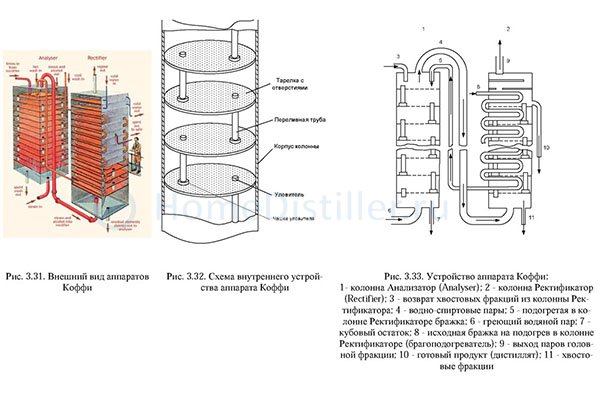 Колонна Коффи состоит из двух колонн: бражной и спиртовой. Внутри колонн расположены перфорированные медные круглые пластины, расположенные по вертикали по всей высоте. Некоторые особенности конструкции: Нагрев браги — холодная брага постоянно подаётся в брагоподогреватель второй колонны,который одновременно является элементом дефлегмации Брага нагревается до температуры около 90°С. Поступление браги на тарелки первой колонны — здесь, встречаясь с паром, который подаётся в нижнюю часть колонны, брага вскипает и теряет спиртовые фракции. Но спиртовой пар, поднимаясь вверх и встречаясь с брагой, также частично конденсируется. Окончательная очистка — происходит во второй, спиртовой колонне. Наиболее тяжёлые фракции, выделяемые в этой колонне, примешиваются к браге, конденсация спиртовых паров производится в верхней части колонны, а головные фракции выпускаются в газообразном состоянии.