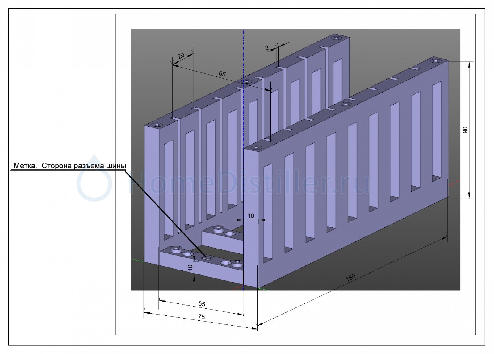 Плата шины устанавливается в корзину разъемом к метке (метка – прямоугольный прилив на первой донной поперечине, см рисунок с размерами корзины). Плата шины крепится к корзине 10 саморезами, для этого на донных перемычках выполнены цилиндрические приливы Ф6 и высотой 2 мм.