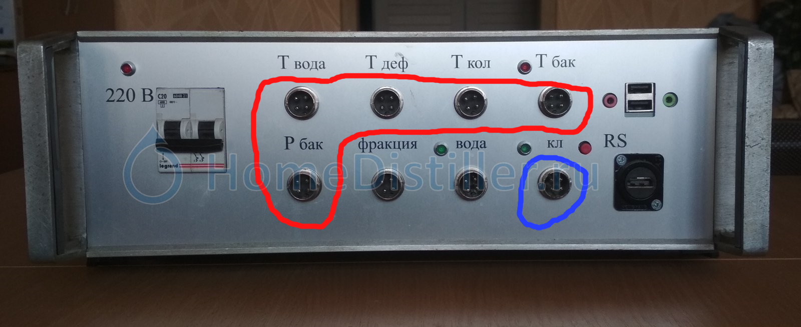 Вот на фото твоя панель. Если ты делал по схемотехнике OldBean, то на разъемах обведенных красным у тебя шина 1-Wire, и там используется 2 или 3 контакта (земля, данные и факультативно +5в), разъем обведенный синим насколько я понял под клапан отбора, на нем либо два контакта под 220 вольт, либо под 12 вольт, либо и то и то как у меня. Разъемы все физически одинаковые. Вот я и спрашиваю не случится ли беды, если по ошибке датчик температуры воткнуть в разъем клапана или наоборот.