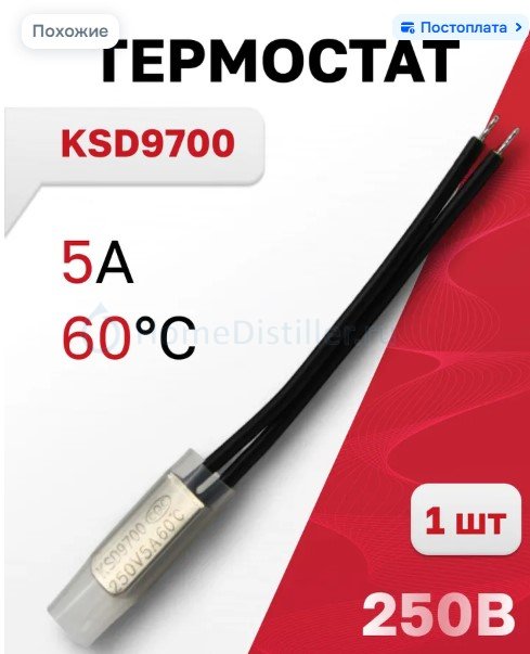 Покупаешь выключатель термостатический KSD нормально замкнутый на температуру около 60..70С. Они бывают двух типов - большие круглые (16А, 20А, их можно подключать сразу последовательно с ТЭНом) и маленькие прямоугольные (термопредохранители) (5А, их можно подключать в цепь питания катушки магнитного пускателя или цепь включения твердотельного реле SSR - тоже продаются).santax1, 21 Апр. 26, 21:02на дефлегматоре чуть ниже выхода воды стоят 2 штуки KSD 9700 NC 50С последовательно (на случай если один залипнет)), в данном месте температура 45С, после отключения воды через 20-30сек срабатывает, из ТСА даже парить не начинает.