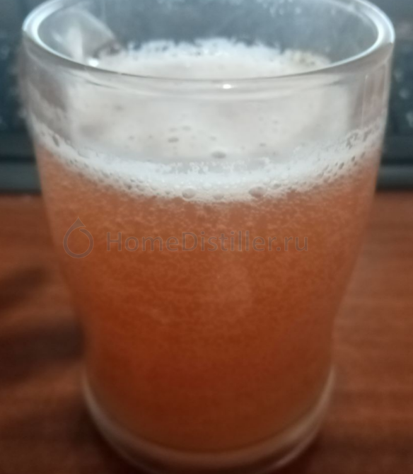 Добавил воды, получил плотность 8,5%. Брожение моментально возобновилось ещё с большей активностью. Смущало выделение сероводорода из гидрозатвора, но когда через 8 часов открыл ёмкость, нормальный запах. Налил полторашку для пробы, за 6 часов закарбонизировалась, потом в холодильнике 4 часа. Газация хорошая, но слишком сладко.