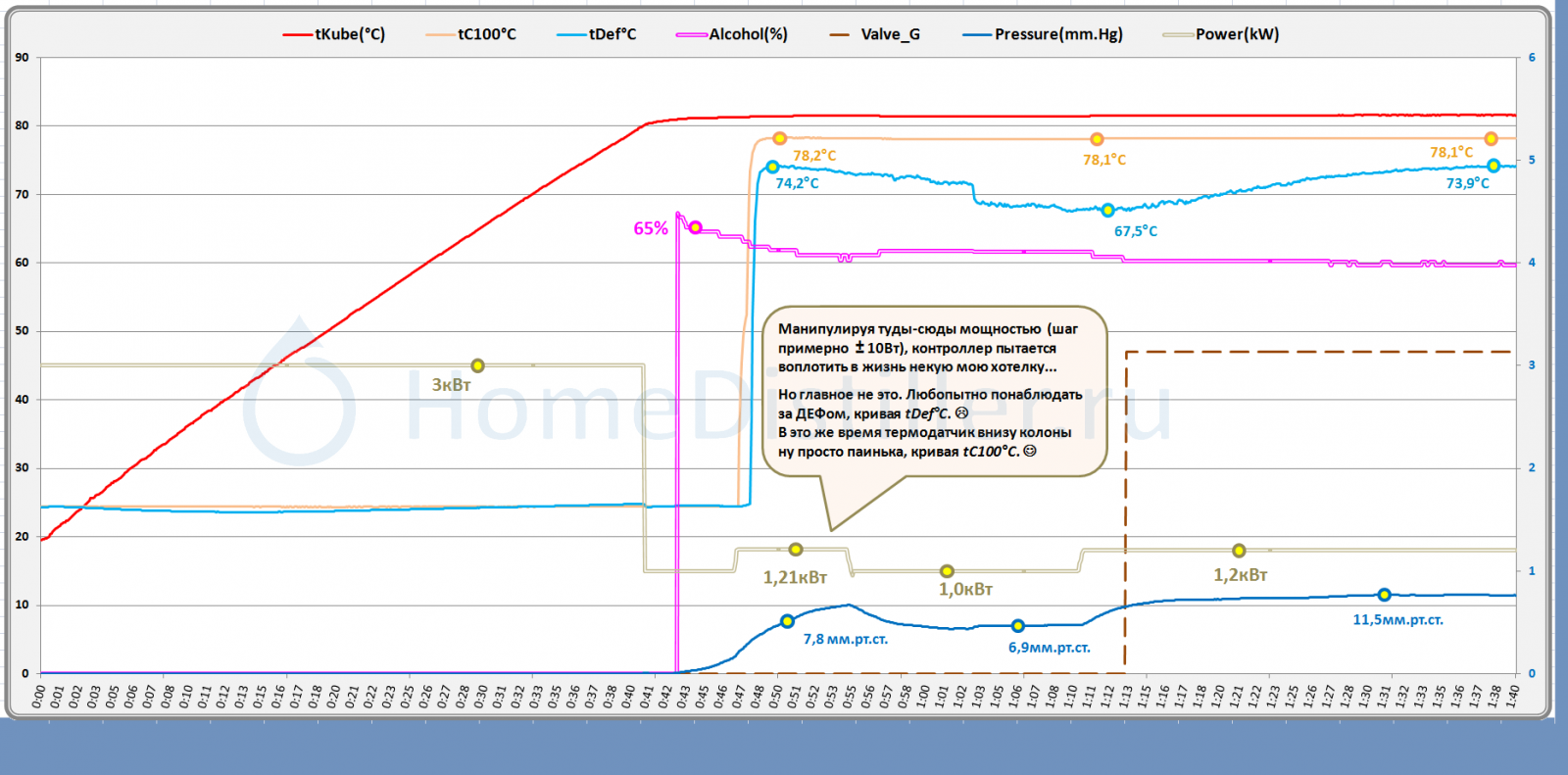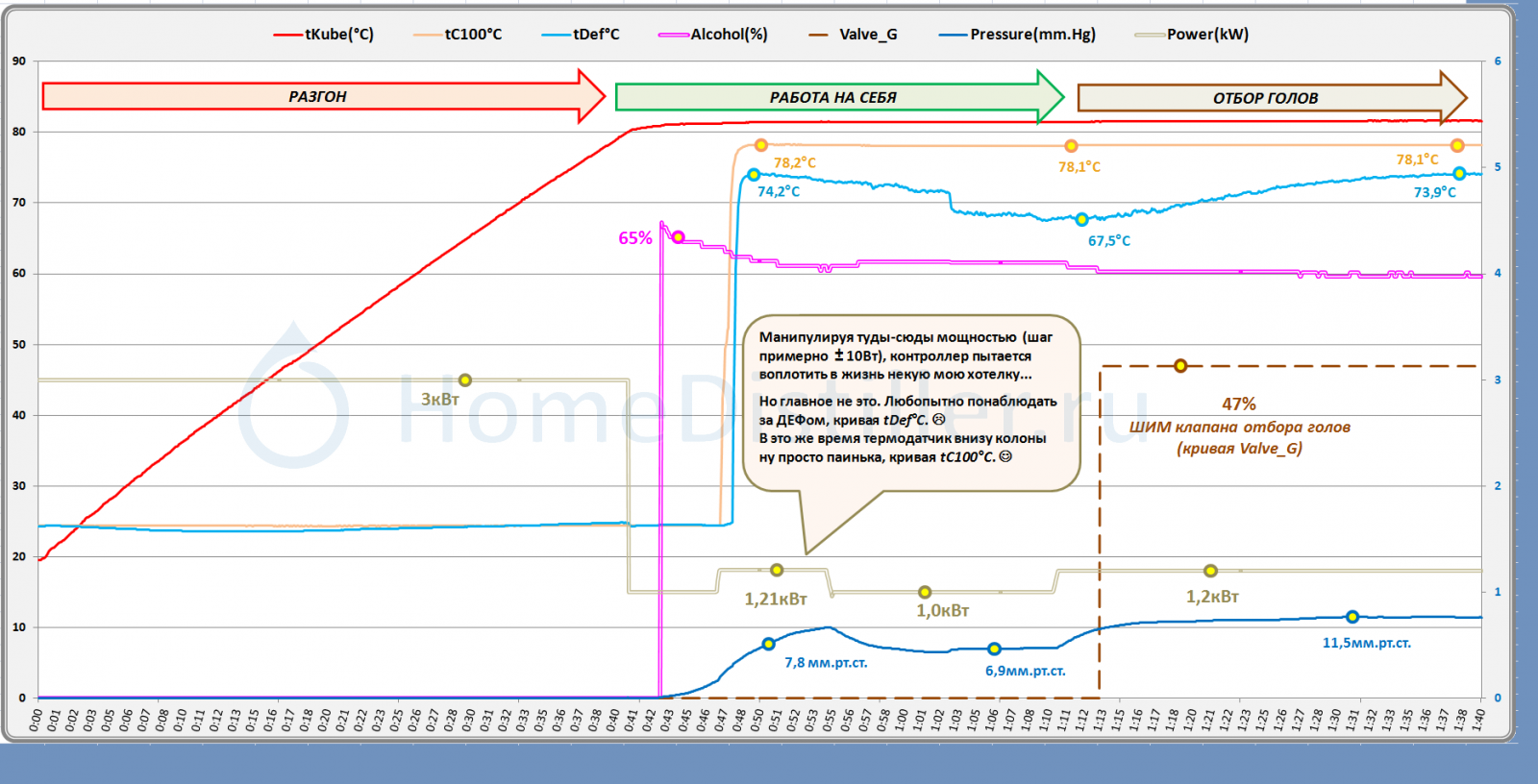 А если быть уж совсем точным, на диаграмме начало процесса ректификации (разгон, работа на себя, начало отбора голов)Esc, 15 Окт. 25, 22:27Кстати, вот этому и соответствует изменение температуры в дефе. Мощность тут не при чем