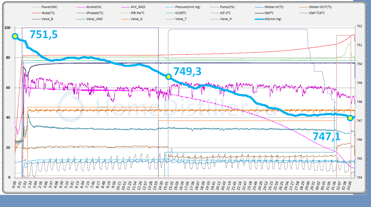 А если быть уж совсем точным, на диаграмме начало процесса ректификации (разгон, работа на себя, начало отбора голов). Почему не весь рект? Причина банальна. Все 33 часа ректа втиснутые в один рисунок не позволят увидить тонкости...