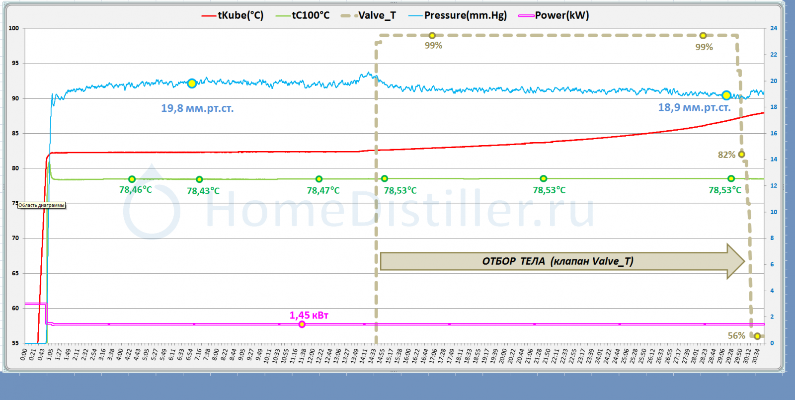 - Pressure(mm.Hg) - кубовое давление в мм.рт.ст. (отсчет значений правая ось ординат);