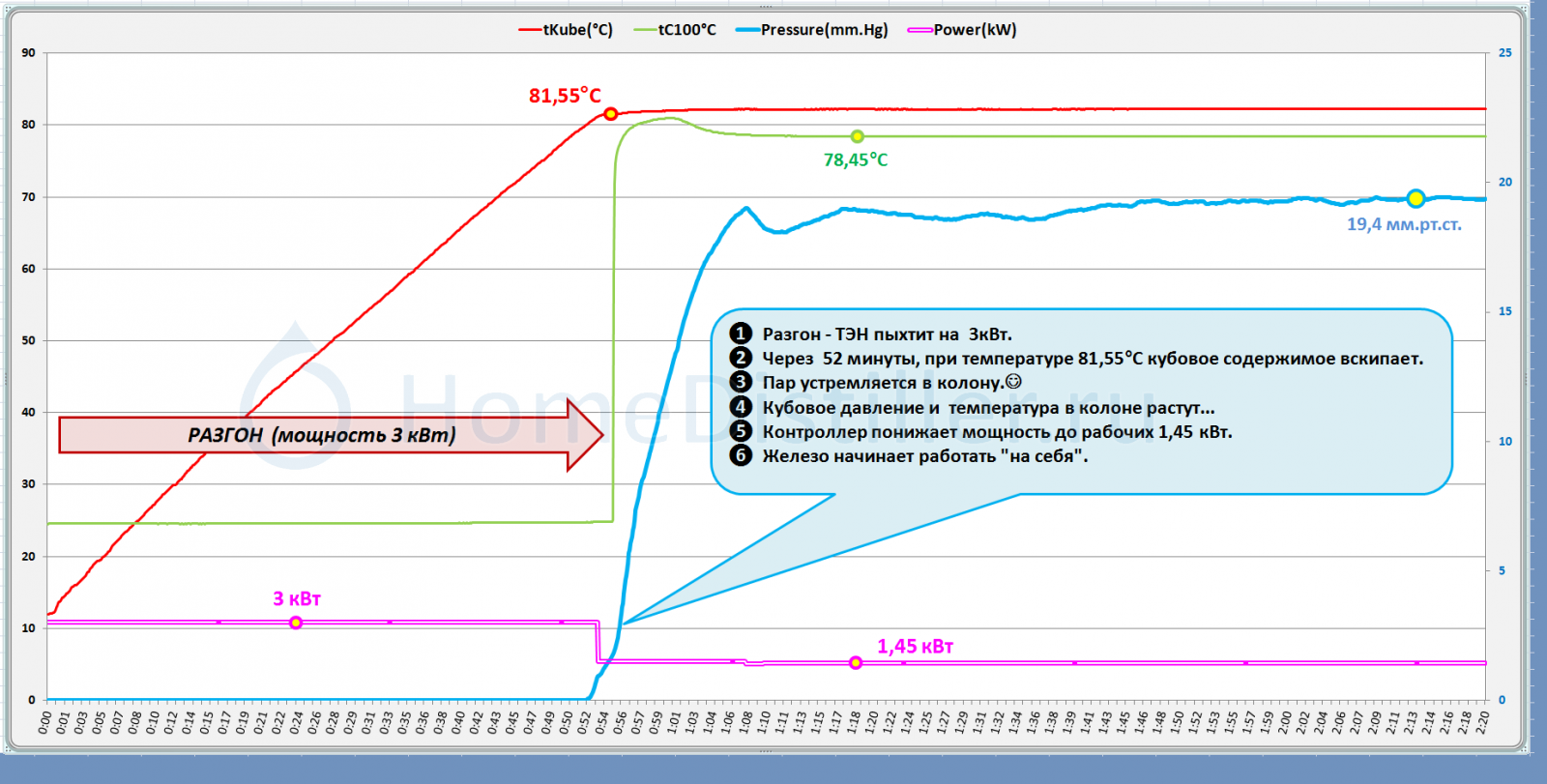 Как по нему правильно определить рабочую мощность?ing050, Вчера, 09:48Подаешь например, 1,5 кВт и смотришь 10 мин. Если стрелка остановилась на каком-то значении - добавляешь 100 Вт. опять ждешь 10 мин. Если стрелка подвинулась и снова замерла - повторяешь цикл. на твоей колонне рабочее давление, как правило, в пределах 15-20 мм рт. ст. Поэтому если при подаче очередной порции мощности стрелка уходит за 25 мм ртути и ползет дальше - уменьшай мощность. Когда найдешь свою рабочую мощность, имей ввиду, что стрелка должна стоять мертво. Если дрожит, значит колонна нестабильна и нужно выяснять причину.