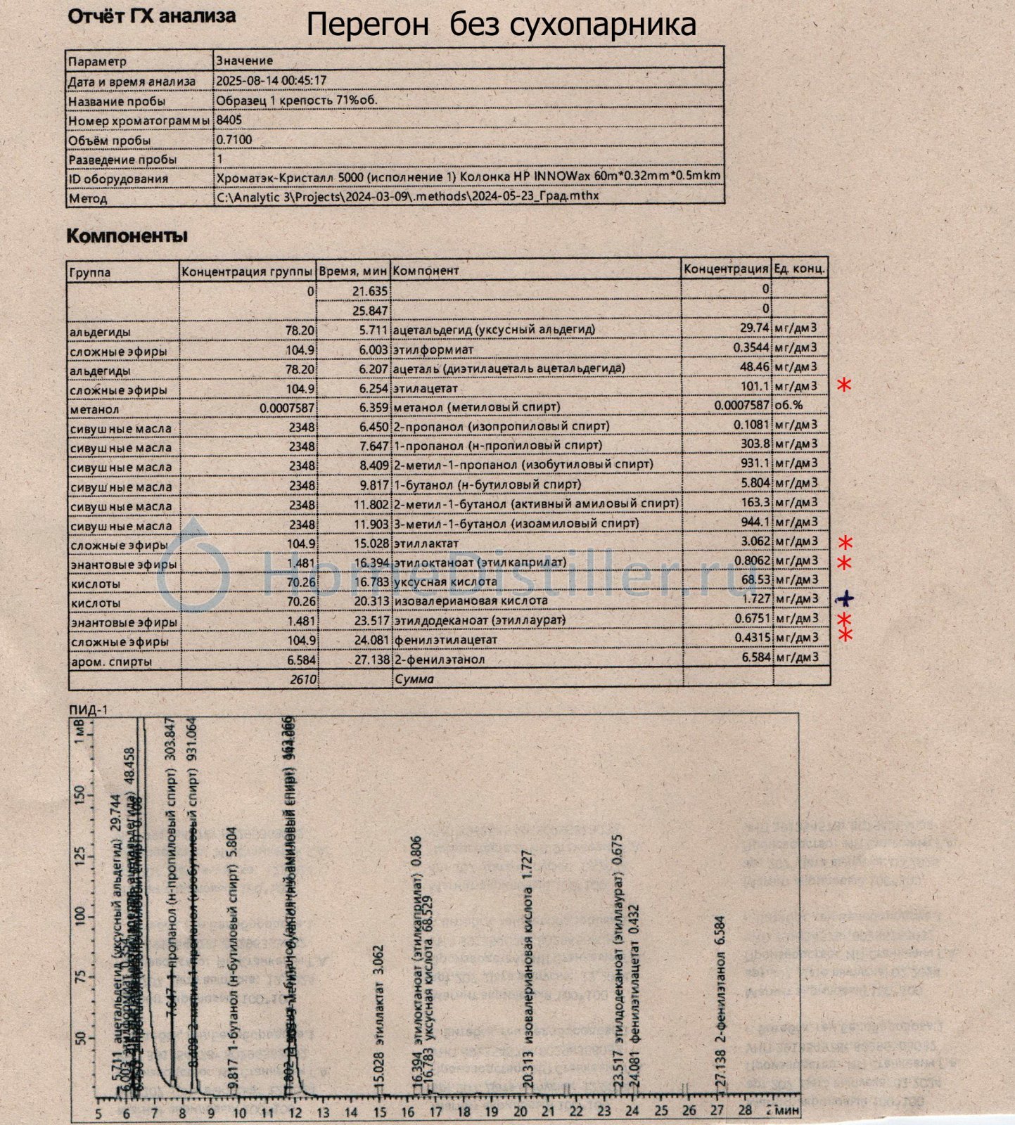 Тема задумана для того , чтобы собрать все газохроматографические анализы результатов различных исследований на форуме ,по теме дистилляции, в одном месте . Обсуждений результатов здесь не будет(случайные будут удаляться). Они будут в профильных темах. Здесь, только краткое описание и ссылки. И здесь не обсуждается ректификация. В этом отличия этой темы от подобной на форуме - [Лабораторные исследования способов очистки самогона.] При материальной поддержке администратора форума мною получены несколько десятков анализов исследований различных методов постановки браги и её перегонки. Все они опубликованы в соответствующих темах и будут собраны здесь. Также, здесь будут собраны все ссылки(которые найду или получу указания на них) на лабораторные исследования других форумчан по теме дистилляции. Всех имеющих подобную информацию и желающих разместить в теме , прошу присылать мне её в личку. Замечания по теме также прошу присылать в личку . ГОСТы по примесям на зерновые дистилляты , ром и коньяк внизу поста. Обращаю ваше внимание,что в ГОСТе на коньяк, для приведения значений к мг/дм3 показатели мг/ 100см3 нужно умножить на 10!