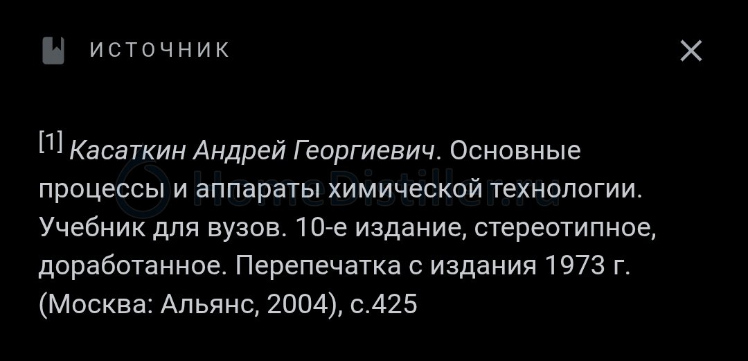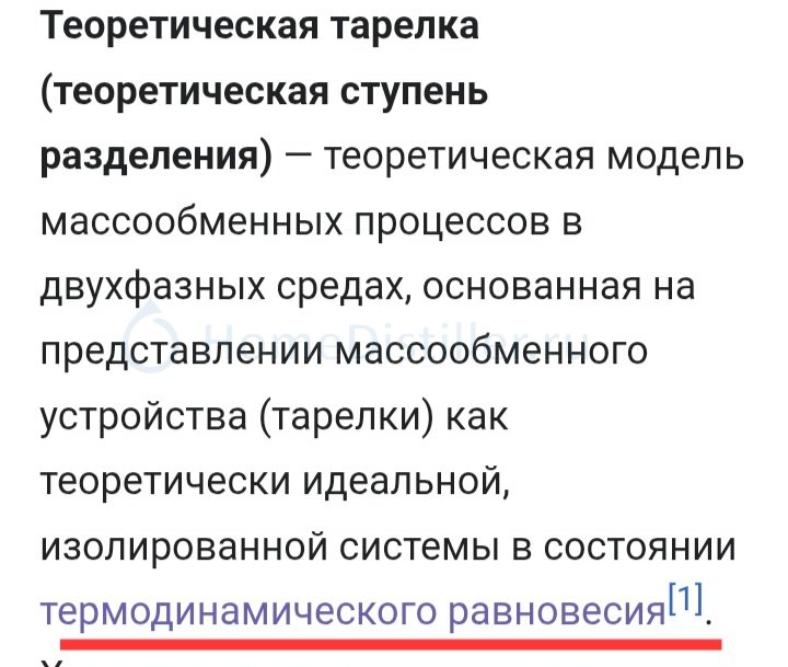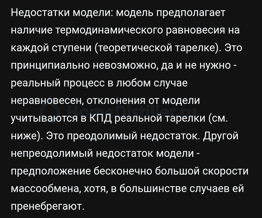 Помогу, чем могу. В реальной насадочной колонне нет теоретических тарелок. Есть степень разделения смеси, аналогичная n-ному количеству теоретических тарелок.Dry Gin, 30 Июля 25, 21:24Мы все свои изыскания приравниваем к ТТ ,и постоянно твердим об этом ,то же графическое построение в которое меня тут все время мордой тыкают ,метод Мак-Кэба и Тиле ,он отображает зависимость состава пара от состава жидкости , при термодинамическом равновесии. Значит оно есть ,пусть и достигается не во всей колонне ,а на участке равным ТТ и если оно есть для ТТ ,то логично предположить, что и в наших колоннах ,оно тоже будет иметь место ,даже пусть и не везде ,пусть только в объеме равной каждой ТТ .