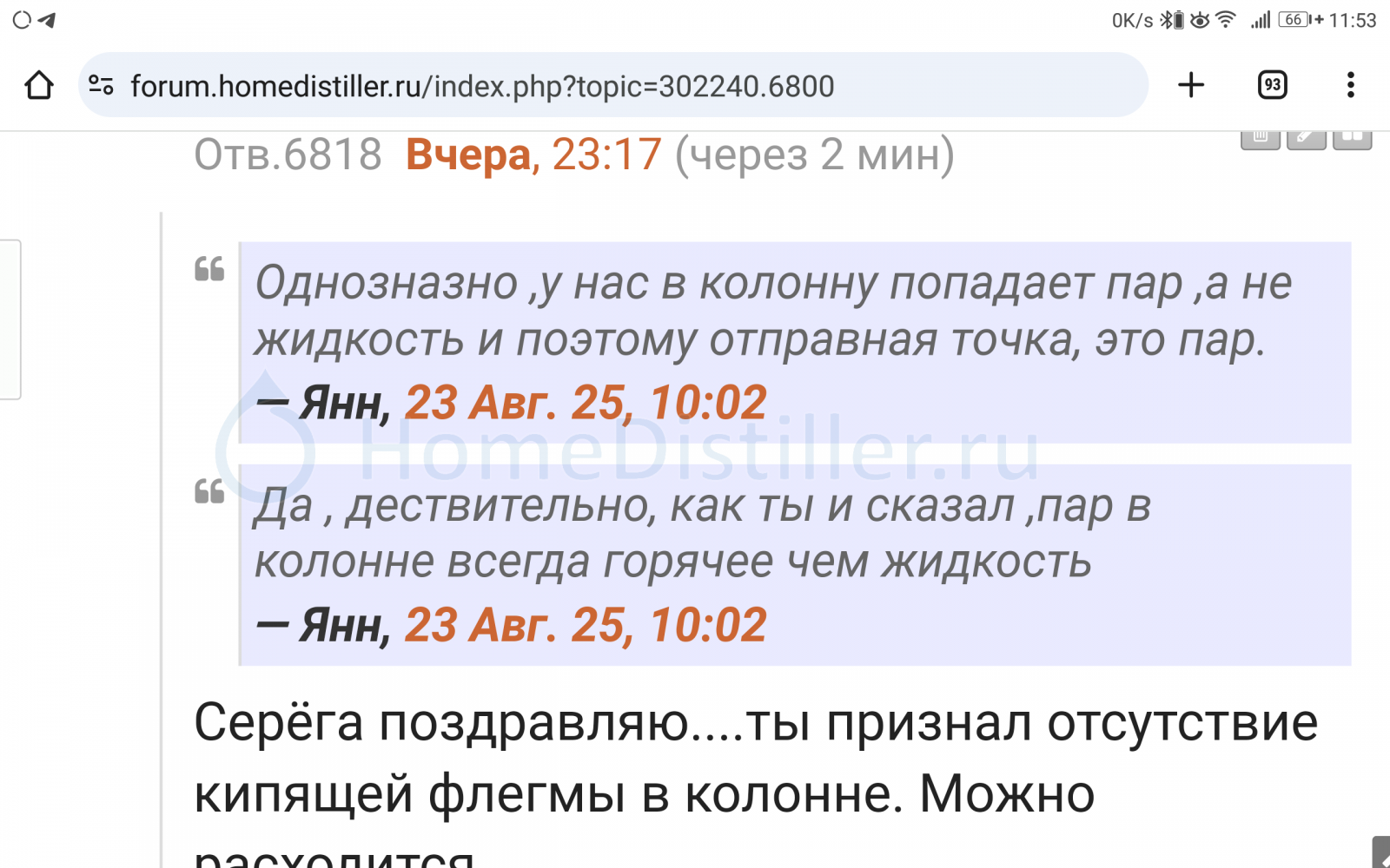 а у флегмы по твоему меткому замечанию температура меньше чем у пара....а значит жидкость не догрета даже до температуры кипения..bardo, 25 Авг. 25, 00:30