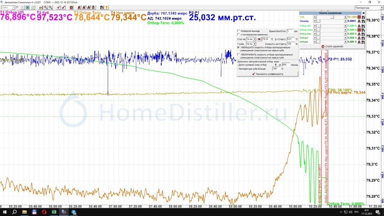 - Режимы автоматической ректификации по одному нажатию. С одним клапаном отбора, с двумя, с тремя. Этапы: Разгон куба, Стабилизация, Отбор голов, Отбор подголовий, Отбор тела, Отбор хвостов, отключение. Автоматически ставятся пометки на графике и посылаются уведомления пользователю на начало каждого этапа.