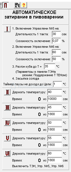 1. Можно 2. Можно, управляющих выходов достаточно. На картинке выше в I этапе видно, что можно конфигурировать до двух "пивных" устройств на выхода 5 и 6. Например мешалку и насос. 3. В данный момент используется только NTC терморезистор. 125С выходит за диапазон его характеристик. Использование чего-то типа платинового PTC требует доработки программы. Но если не интерпретировать значения с АЦП точно в градусы, то можно и припаивать использовать PTC (до 500С). Как это делается с датчиком проводимости. Если нужен только определенный диапазон около 125С, то можно калькулятором коэффициентов подогнать, чтобы в градусах относительно достоверно и на PTC показывал. 4. На данный момент есть возможность использовать до 6-ти термопауз. 5. Второй ТЭН на отдельный канал управления, и отключать либо в ручную, либо привязать его работу к одному из входящих параметров (температура, давление и т.п.). К примеру включен, пока давление в кубе ниже 5ммрс, а выключать в ручную.