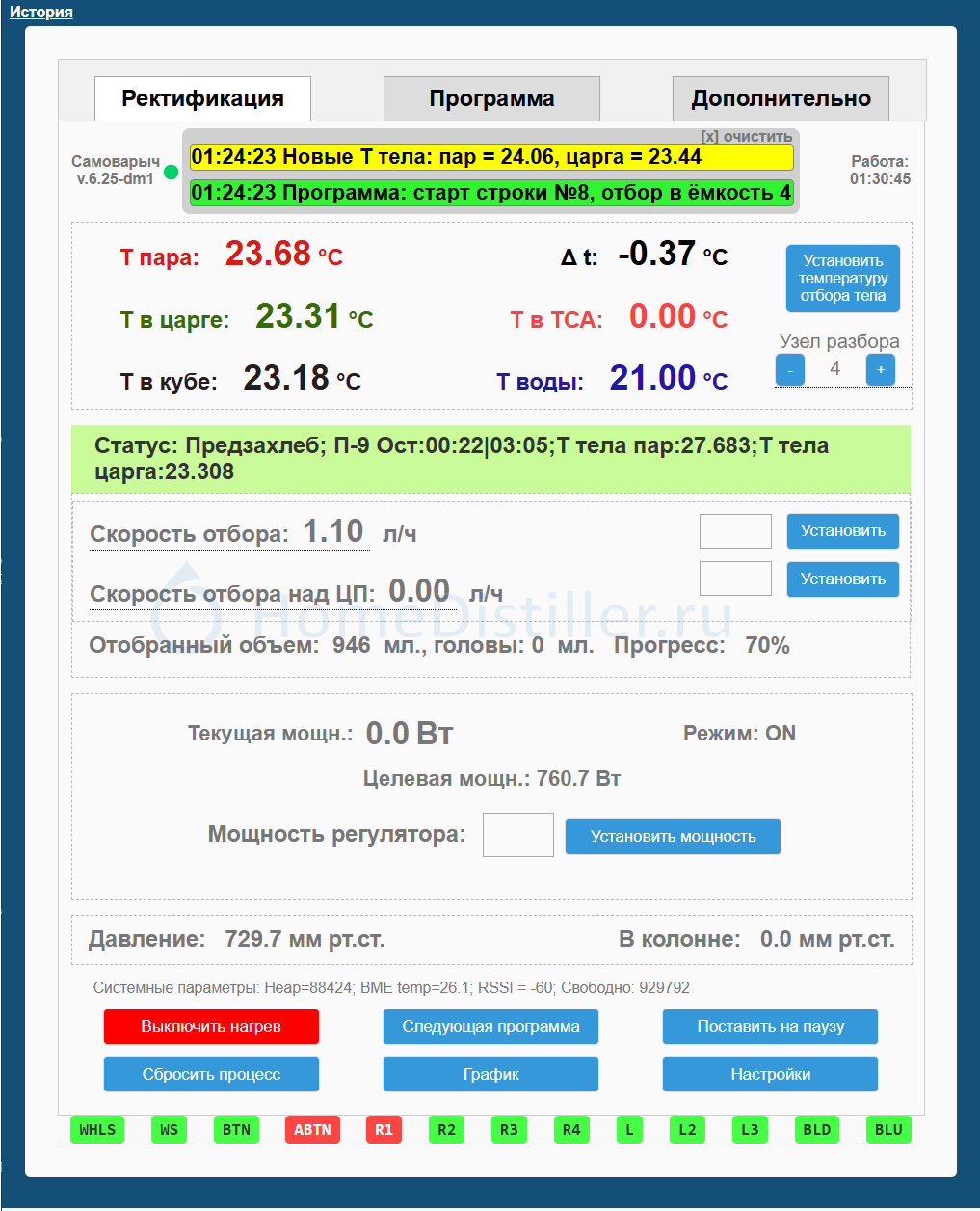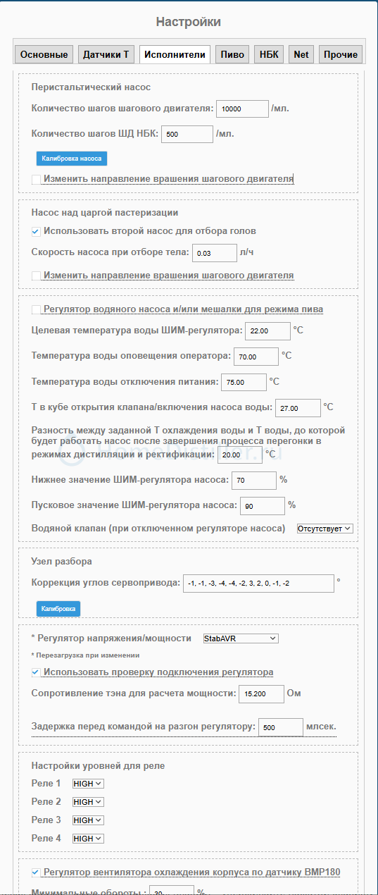 6. Добавлен в логику и настройки второй насос для отбора голов над царгой пастеризации при ректе. Доделан index.htm для корректного вывода скорости второго насоса и отобранных объёмов. Перенесено ручное управление скоростью и кнопка перезадания опорных температур на первую вкладку, добавлено ручное управление вторым насосом.