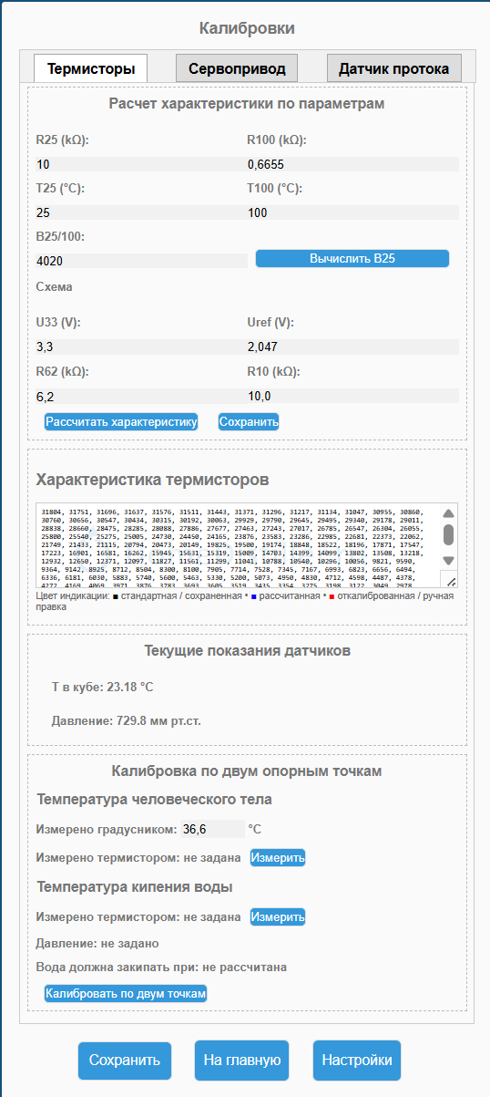 35. Добавлена страница калибровок: Расчет характеристики термисторов. Калибровка по 2 замерам (подмышка и кипение с поправкой на атм. давление). Калибровка датчика протока воды, узла разбора.