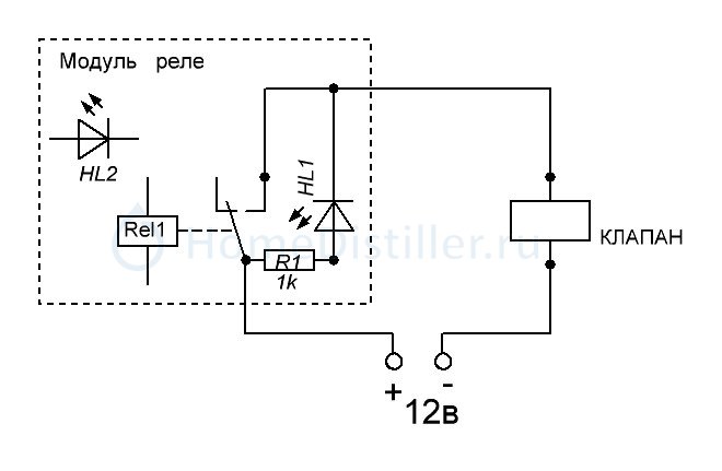 Схема Целостность цепи. Автоматика Самовар. Вопросы по электр(он)ике. - При подаче питания 12 вольт, загорится светодиод HL1. Если цепь неисправна или клапан не подключен, светодиод не загорится. - При подачи команды Самоваром "Открыть клапан" загорится светодиод HL2, что говорит о том что с самовара пришла логическая единица. Реле замкнет контакты, клапан включится, светодиод HL1 погаснет.