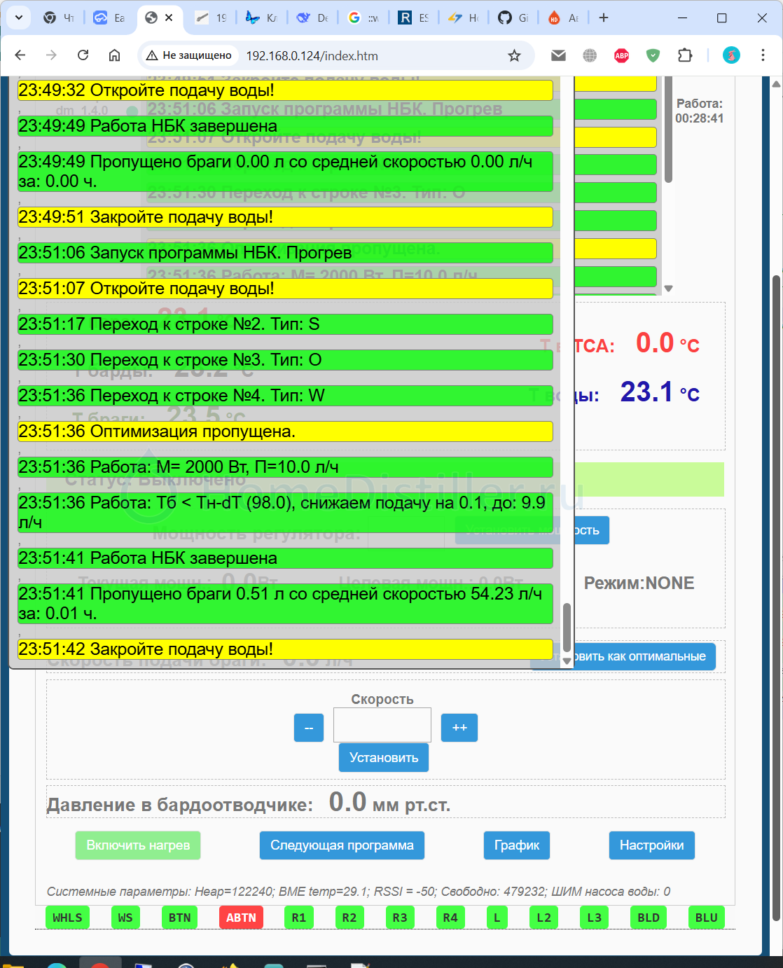 Обновился на 6.26. Нет проблем - есть особенности. Как было сказано ранее разработчиком: - сохраняем настройки. - устанавливаем SDK 2.0.19 - чистим каталог Документы-Arduino- …. Копируем туда Samovar , библиотеки и инструменты. Не оставляем в Документы-Arduino- …. файлы прежних релизов Короче, все по методике установке в справке. Не отступаем от рекомендаций . Устанавливаем релиз 6.26 Устанавливаем локально WEB-интерфейс. Восстанавливаем настройки из сохраненного файла. Проверяем логины и токины Телегам и Blink. Если их нет, копируем из сохраненного файла настроек , вручную, и вставляем в соответствующие поля. Шаги шагового двигателя не устанавливаются при восстановлении настроек - это сделано специально. Смотрим значение в сохраненном файле настроек : Параметр «StepperStepMl». Прописываем в настойках шагов ШД вручную. Все работает.