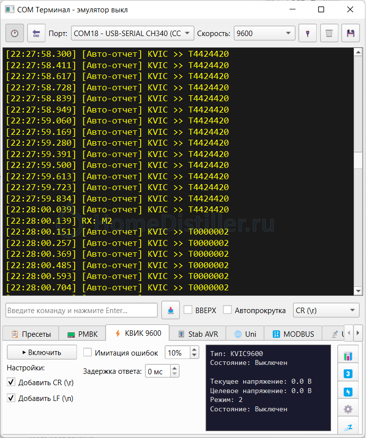К сведению. Регулятор Kvic шлёт непрерывно своё состояние, вне зависимости от запроса, 5 раз в секунду. В текущей прошивке (на гитхабе). Внимание для тех кто вдруг решит обновляться. Скорость обмена по UART в новой прошивке изменена на 9600Kuban, 05 Марта 25, 17:43