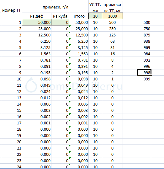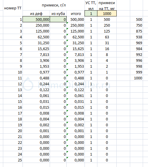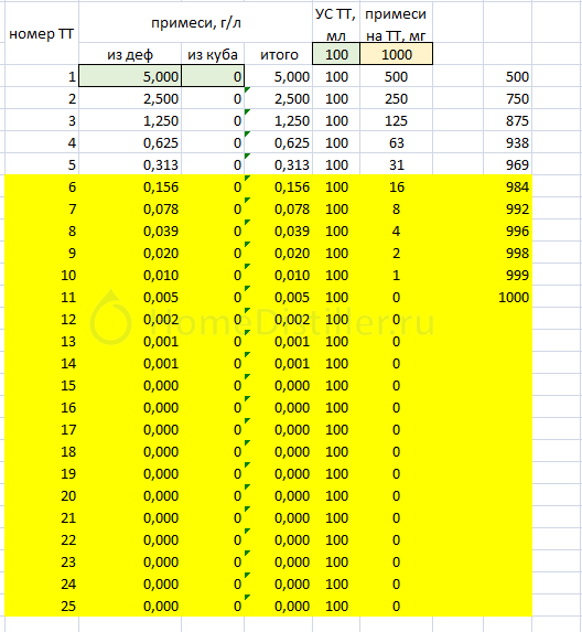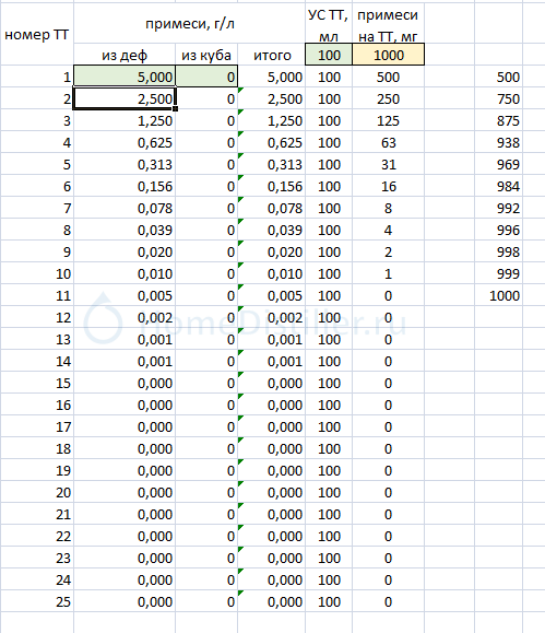 вот, например случай когда УС 1 ТТ равна 10мл, к.рект принят постоянным и равным 2. Под дефом на 1й ТТ 50гр/л, если ты захочешь забрать 99,9% примеси тебе надо слить 10ТТ, это 100мл. Средняя концентрация примеси в головах 10гр/литр изображение_2025-10-22_091849789. ВЫСОТА насадочной части одинаковая, а ДИАМЕТР разный. Где чище спирт. Вопросы по конструированию.