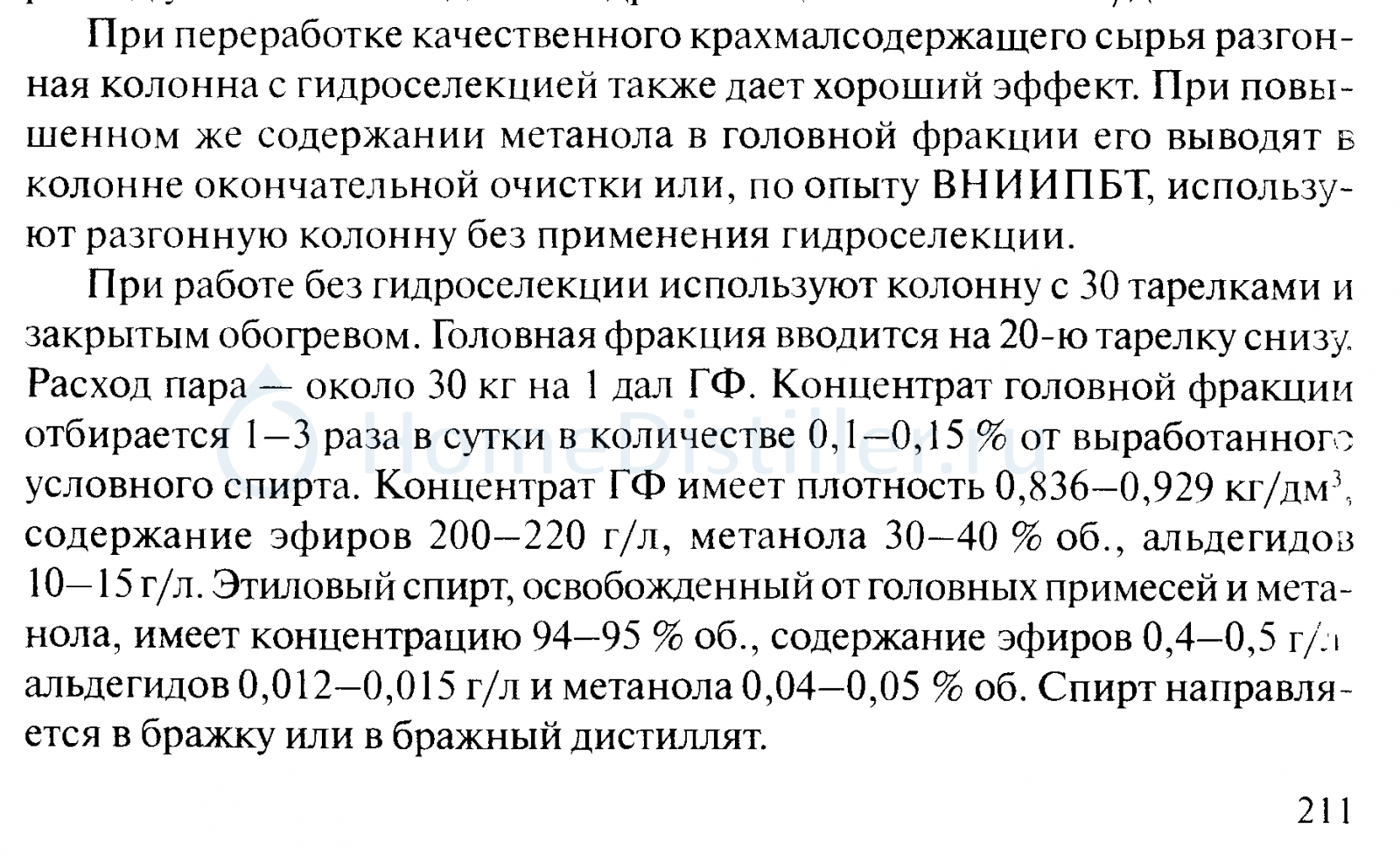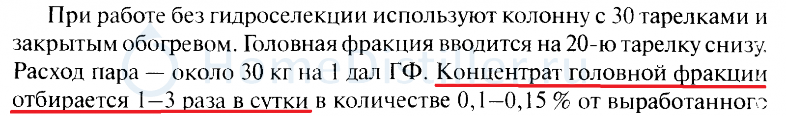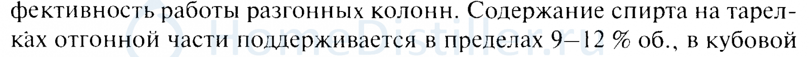 Основной принцип промышленной разгонной колонны; ГФ разбавляют водой и держат спиртуозность в отгонной части 9-12%.