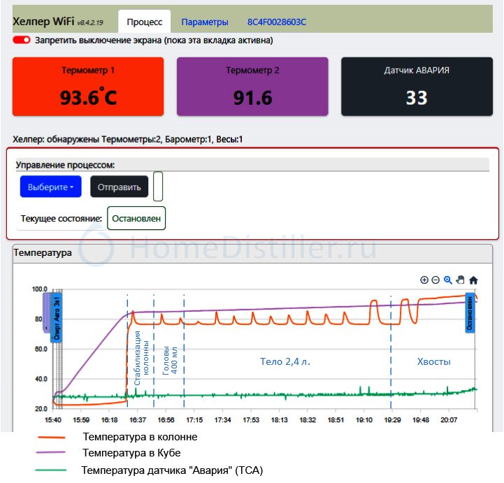 "Хелпер Wi-Fi" - Многофункциональная, многорежимная, умная автоматика для домашней винокурни, способная сама принимать оптимальные решения в процессе: 1. Перегонки браги. 2. Получения спирта, в автоматическом режиме, с розливом Голов, Тела, и Хвостов по установленным ёмкостям.. 3. Затирания солода. 4. Изготовления пива. 5. Автоматическое управление водяным охлаждением. 6. Автоматического обновления программного обеспечения автоматики. 7. Управление работой автоматики как удалённо, через Интернет, так и с базового блока Хелпер Wi-Fi. 8. Автоматическое удержание комфортной для браги температуры брожения в независимости от температуры окружающей среды или разогрева самой браги в процессе брожения. 9. Автоматическое отображение текущих процессов в виде графиков трёх температур.