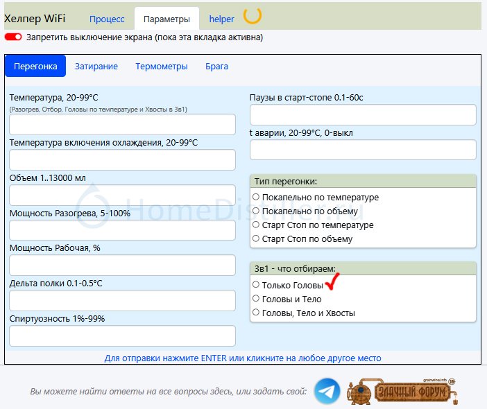 Новая версия автоматики Хелпер Wi-Fi v8.5.0 - можно заказывать! 1. Добавлен новый режим "Спирт Авто 3в1" c возможностью в едином цикле перегнать Головы, Тело и Хвосты с розливом по заранее установленным для этих фракций ёмкостям. Винокур задаёт только объем Голов и температуру окончания Хвостов, все остальное автоматика делает сама. Также винокур может выбрать, что отбирать: - только Головы; - Головы и Тело; - Головы, Тело и Хвосты. Режим "Спирт Авто 3в1" для Голов и Тела использует новый алгоритм скоростного отбора без потери качества продукта. При этом: Игольчатый кран для регулировки скорости отбора не нужен или должен быть открыт полностью. Холодильник (бывший доохладитель), через электромагнитный клапан, должен быть подключён к системе холодного водоснабжения. (Доохладитель обязательно заменить на полноценный холодильник). В итоге винокур получает десятикратное ускорение процесса отбора Голов, а при отборе Тела отпадает необходимость корректировать скорость отбора.