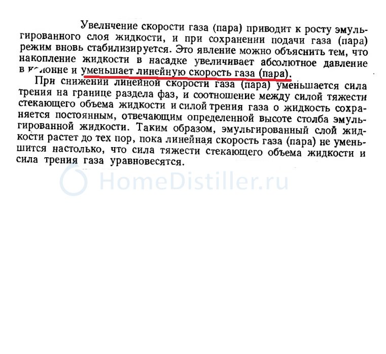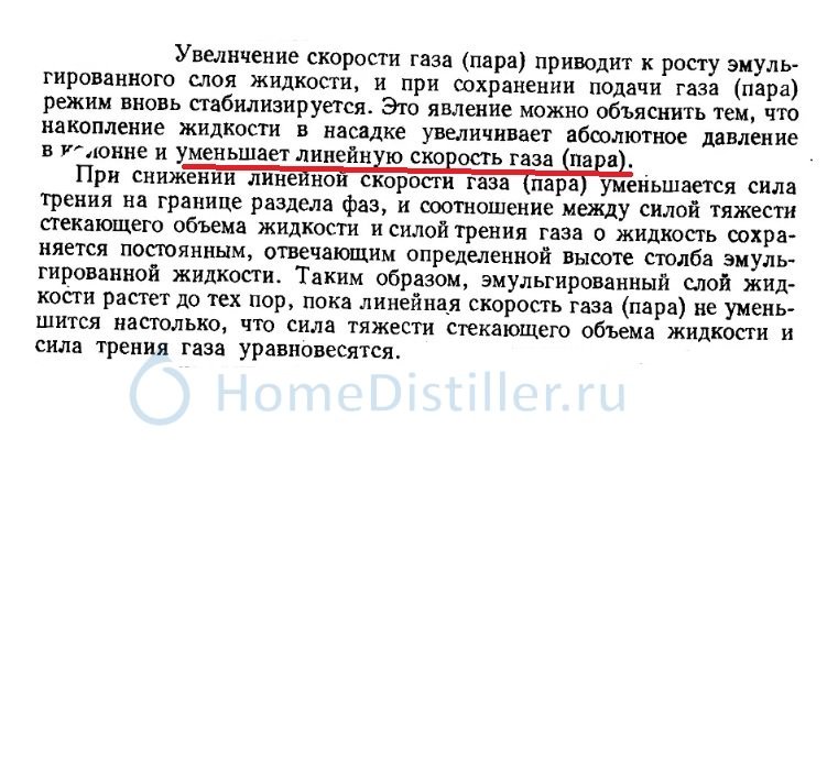 Янн, а ты сам весь абзац прочитал ? там вначале есть одно неприятное если "при сохранении подачи газа", такой случай эмульгации прокатит с воздухом. А с колонной и кубом так не получится. С ростом давления скорость пара падает и куб начинает перегреваться, давая меньше пара и запасая энергию в жидкости, а колонна - флегму на насадке, это пружина с грузиком, грузик увеличивается, пружина сжимается и в это время ты стол (мощность) вниз дергаешь. Пружина распрямляется (куб дополнительно кипит), грузик летит вверх (флегма в дефлегматор) а пропорциональный регулятор по падению давления еще и стол (мощи) вверх подкидываетdee, 31 Окт. 25, 15:57Вопрос первоначально был где больше скорость пара в эмульгационной колонне в верху или внизу. Я утверждаю что внизу, так как жидкость из за сил трения снижает скорость пара, часть энергии пара уходит на нагрев флегмы и пузырек теряет свой объём, ну и сопротивление самой жидкости ,жидкость имеет вязкость. При повышении давления растёт температура кипения а это опять дополнительная мощность. Поэтому в плёнке колонна захлёбывается при 2кВт , а в эму режиме работает при 2,2 кВт. Это теория, но она подкреплена практикой , а значит верна. Утверждение том ,что скорость пара в эмульгационной колонне выше в верху колонны, это не верно.
