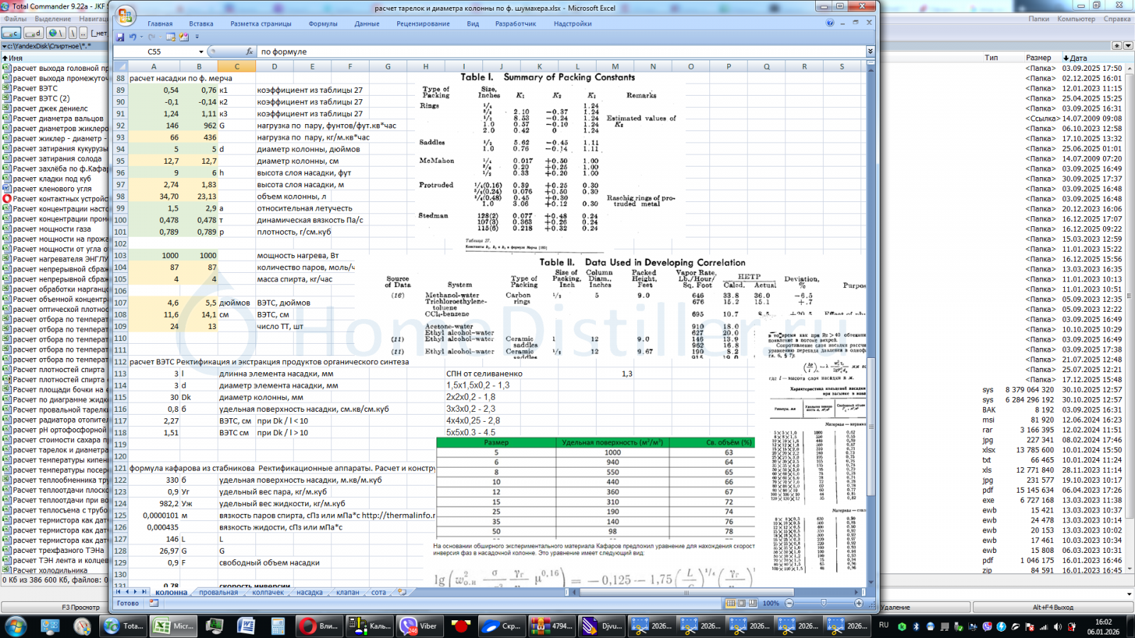 Самим то не смешно ? Смотрите как надо и учитесь ,показываю вам мастер класс в расчёте и проектировании домашней ректификационной колонны Пошли купили царгу 2" высотой 1 метр Пошли купили нержовых мочалок штук 15 , с запасом. Напихали их в эту царгу. поставили царгу с мочалками на куб ,ну и далее как обычно УО и дефлегматор. Железо гением ума спроектировано и собрано ,но не имеем тактико технических данных для сравнения и отчетности. Не порядок. Тащим ЭВМ и измерительные прибора . Термометр ,ареометр, сикундомер, измерительную колбу ну и для пущей важности барометр. Думаю хватит. Наливаем в куб ССЖ примерно 30% можно и 10% и 50% ,не важно. Запускаем агрегат. Работа на себя час, потом открываем медленно отбор ФЧ=100 это примерно отбор 50 мл на 1кВт мощности . Отбираем продукт для измерения спиртуозности. При 20* при давлении 760мм ртутного столба , наш АСП-1 показал 96,5% Включаем ЭВМ, или рисуем ступени на кривой равновесия фаз . Начальная спиртуозность 30 % (Виктрыч для тебя ,в кубе не в колонне ) на выходе имеем 96,5% ФЧ =100 ( бесконечность) ЭВМ выдает 14 ТТ И так определили итоговую цифру для нашей колонны . Забиваем ее в отчё. Высоту знаем 1 метр. Конструктора требуют ВЭТС насадки. Забиваем данные в ЭВМ 1000мм : 14 ТТ =71,4...... мм И так, нашим конструкторского бюро была спроектированная колонна 2" высотой 1 метр на мочалках и рассчитанная с помощью ЭВМ , имеет Потребляемую мощность 1000 Ватт Производительность 50 мл в час Разделительную способность 14ТТ ВЭТС насадки 7,1см .Янн, 06 Янв. 26, 08:45