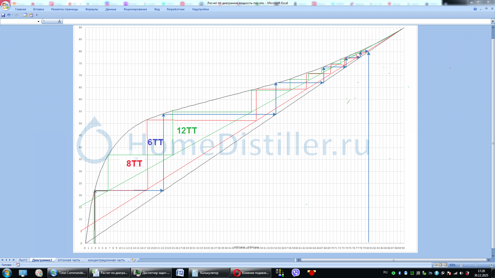 Немного не догнал. Залил в куб 30 оборот. Получил 96,6 на n TT. Просел куб до 3х. Хрен ты получишь те же 96,6 если нет запаса по ТТ к тем n. Я про это. Это ещё про промежуточные не упоминали.Виктрыч, Вчера, 12:51Во первых смотрим на работу нижней ТТ ,у неё подпитка спиртом и сверху и снизу из куба ,в кубе снизу Колонна должна быть наполнена спиртом ,и мы не можем отбирать спирта больше ,чем его поступает на первую ,ТТ ,но наступает момент когда заполняется колонна с низа промежуточными или водой и мы вынуждены добавлять ТТ , что бы удержать слой спирта над "отходами ". Заметь добавлять,для удержания ,а если принять тот факт ,что у нас в колонне число ТТ постоянно ,просто спиртуозность разная ,то как то все не понятно будет выглядеть . Мы говорим за "живую " колонну и что там происходит. И как мы можем влиять на это "происходит "