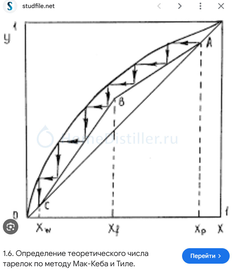 где написано что ступеньки на графике НЕЛЬЗЯ называть теоретическими тарелками, что можно - я приводил, вот тебе первый же запрос в поисковик. И тут два варианта; 1. ты пургу гонишь 2. учебники врут изображение_2026-01-10_230401530. Влияние подаваемой мощности и др., факторов на разделительную способность колонн. Вопросы ректификаторов. 4.3.2 Расчет оптимального флегмового числа Оптимальное флегмовое число Rопт определяем путем построения и анализа графика функции N R f R где Nт – число теоретических тарелок, обеспечивающих заданное разделение смеси в колонне при данном значении R. изображение_2026-01-10_230812528. Влияние подаваемой мощности и др., факторов на разделительную способность колонн. Вопросы ректификаторов. и таких картинок в книгах - миллион, беда в том что ты не одной не прочитал