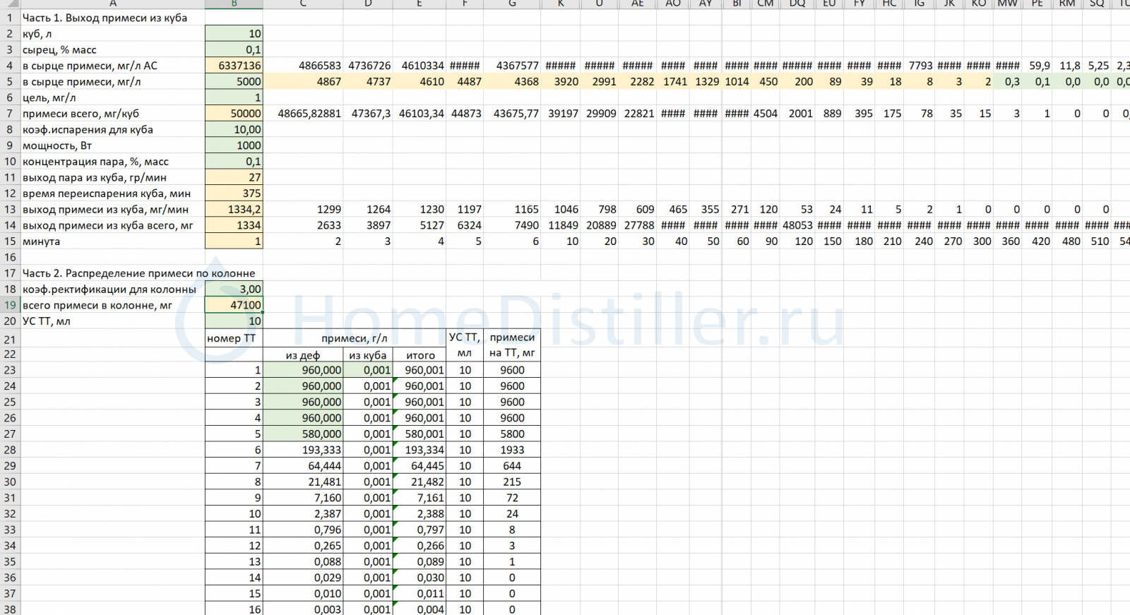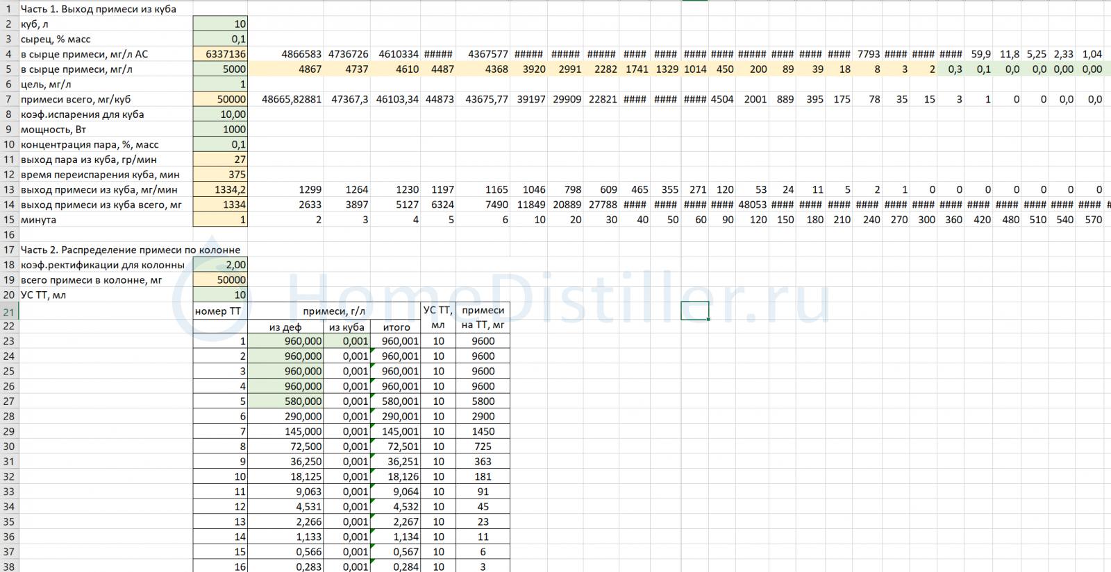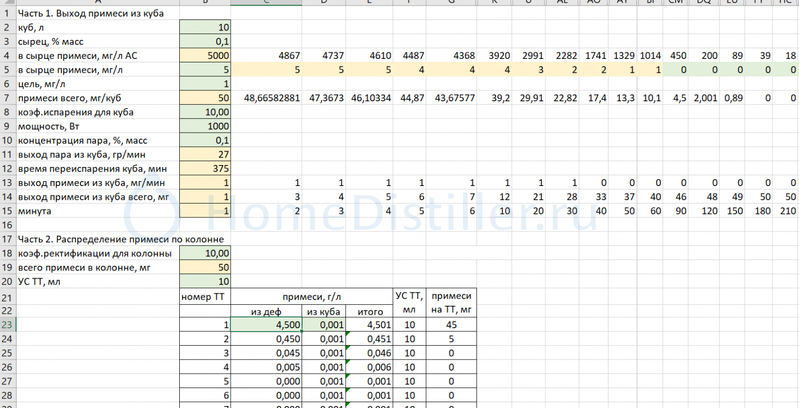 Reriver, да, когда полностью выйдет, только будет 0,45%, я поправил расчет. До уровня 1мг/л в кубе спирт снизится за 61 минуту, в колонну зайдет только 40 мл из 50. При полном выходе примеси из куба концентрация дальше не повысится, само собой, её больше нет в кубе ))) Вопрос что абсолютно полный выход примеси в принципе не возможен, можно говорить о каком то количестве девяток после запятой но на распределение примеси по колонне это уже мало скажется. И для некоторых примесей возможна этерификация, ну это тоже не учитывается. Абстрактная модель, как никак.