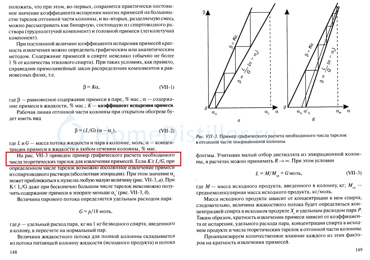 Если вы считаете ,что в выворочном участке эпюрационной колонны присутствуют ТТ ,то тогда у вас нет проблем с графическим построением этого участка по методу МакКэба-ТилеЯнн, 19 Марта 26, 23:54не "вы считаете" а так написано в учебниках, вполне логично обосновано, графическое построение тут непричем, оно для спирта, для ГФ есть формулы - K*G/L в степени числа ТТ. Хотя спирт тоже головная примесь по отношению к воде но в ЭК нет его укрепления только из-за малого отбора из концентрационной части. Т.е задержка по спирту у колонны закончилась и он сваливается в эпюрат а по ГФ задержка не кончилась, и головы идут по исчерпывающей царге вверх. Начни тащить много спирта из-под дефлегматора концентрационной части и эпюрационная колонна превратится в бражную. Прекрати отбор ГФ из дефа и они свалятся в эпюрат как и спирт, со временем, где время - задержка колонны по примеси, она же удерживающая способность поделенная на скорость поступления. Разница между поведением спирта и ГФ в ЭК только в их количестве, поступающем в колонну.
