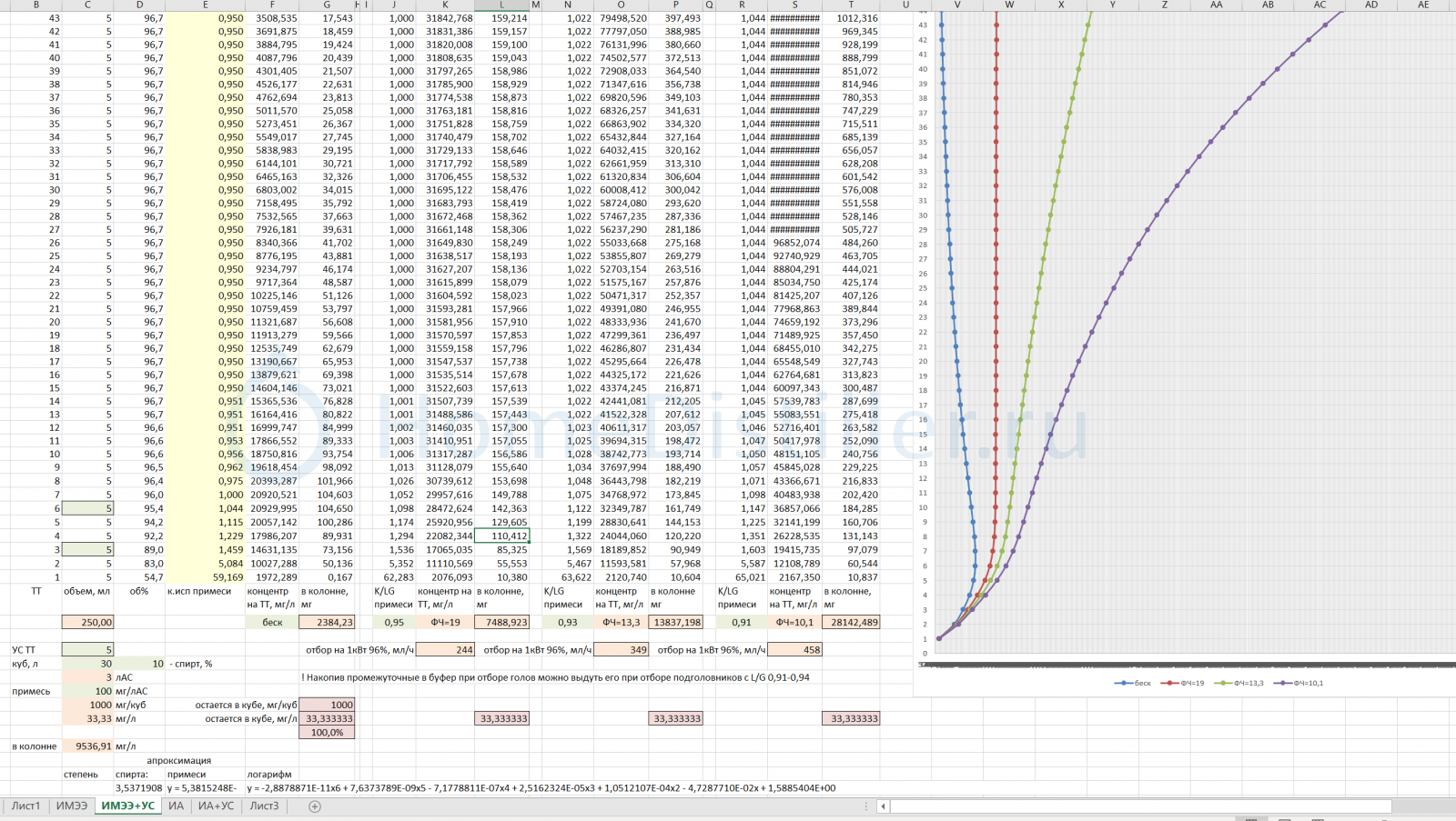 У нас сивухи в кубе в 6 литрах по АС в СС всего 5 гр . 10 см насадки 20 мл способны удержать 1 гр , на удержания 5 гр нам надо 50 см колонны ,если учесть что вся колонна 30ТТЯнн, 11 Апр. 26, 07:05Нет: определяешь концентрацию воды на каждой тарелке, в экселе забиваешь эти тарелки с учетом киспов примесей, УС тарелок, L/G, объема и начальной концентрацией в кубе, и видишь картину распределения примесей по тарелкам.
