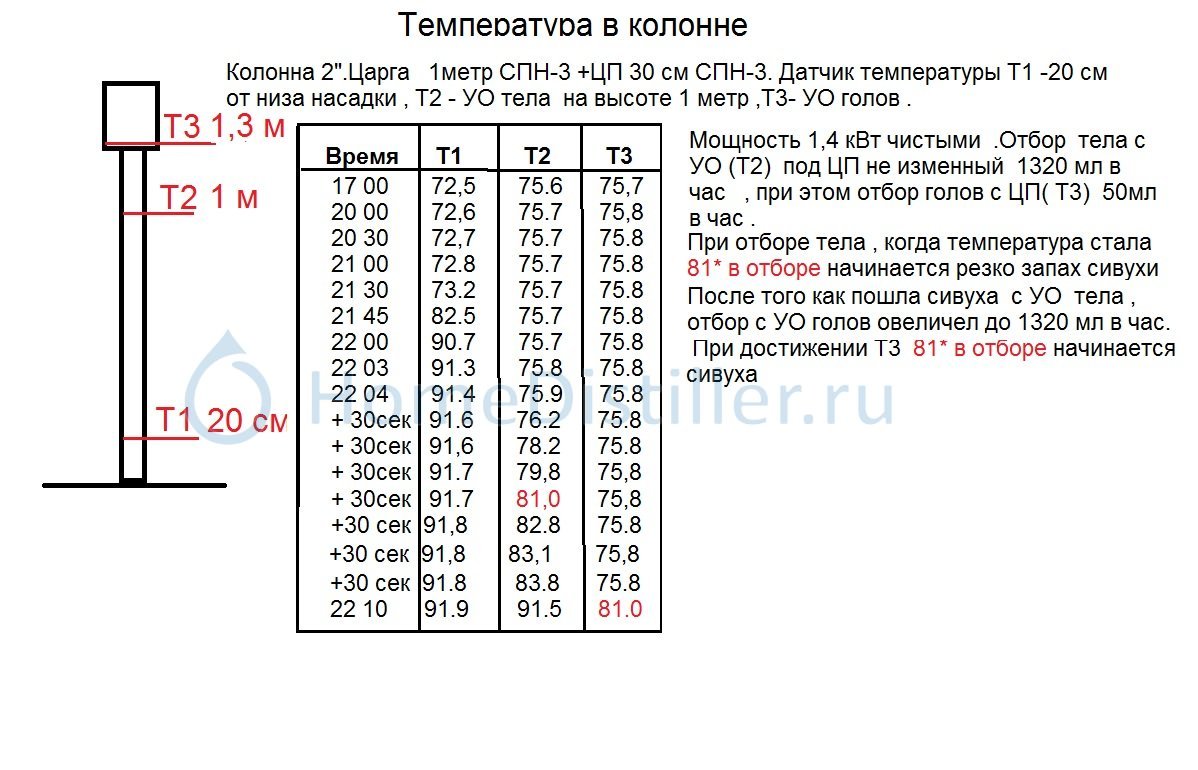 Если сивухи снизу 100мг, а температура растет, то в отборе мы получим низкую спиртуозность и грязный спирт 81%. (Отсюда и мнение что спиртуозность целевого продукта есть показательего чистоты .) Причем от высоты колонны это завсить не будет .держит сивуху спирт .Обуславливает её поведение Крект .А не объем И тотже ПБ это не накопитель сивухи ,а накопитель спирта .