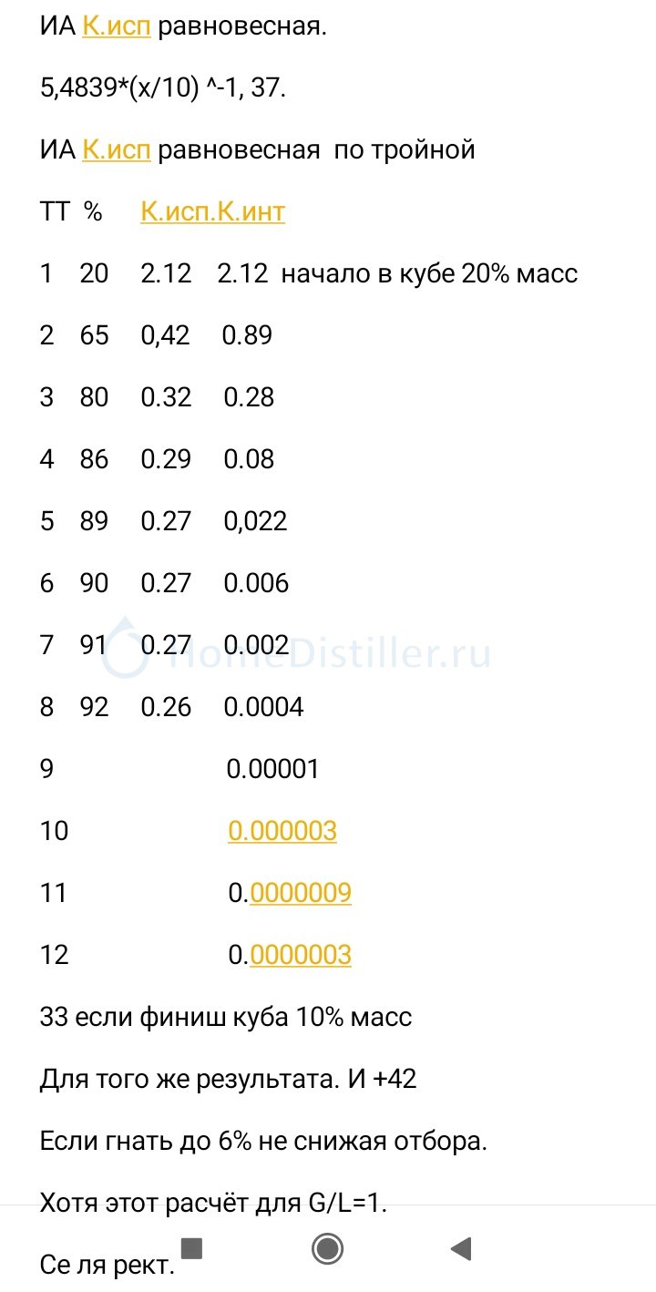 Первая, куб.Виктрыч, Вчера, 21:40У меня первая ТТ это не куб. Куб - нулевая. При 1% этанола в кубе макс концентрация 40% ИА на 2-й ТТ, в кубе остается 8г ИА из 30-ти. При 7% этанола в кубе макс конц 7% ИА на 1-ой ТТ, в кубе остается 28г ИА из 30-ти.