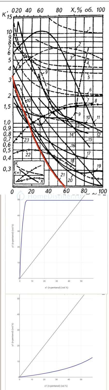 Вот склейка из моих архивов. Верхняя думаю без вопросов. Средняя равновесная самой распространённой версии амилола с водой. То есть до 7% его он в, воде растворим и ведёт себя как обячная головная. Лишние уже нерастворимы и выталкиваются водой этим слоем до какого-то момента. Около 50 он своей господствующей температурой кипения сам начинает выпаривать воду. Напомню, что она 132. И само собой становится хвостовой. Как кирпич на дне кастрюли. Нижняя картинка. Амилол каки любой спирт дружит с этанолом и как старший брат всегда уступает дорогу и идёт хвостом. И тусуя данные из этих картинок можно получить любую нужную равновесную. В первом приближении. Или хотя бы понять тренд. Нижние в объёмных.Виктрыч, 20 Апр. 26, 08:18