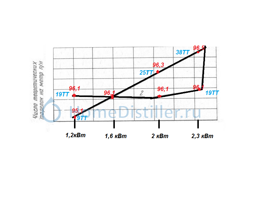 Без имени. Влияние подаваемой мощности и др., факторов на разделительную способность колонн. Вопросы ректификаторов. В итоге получил продукт 96,55% (96,6) И это на обычной колонне ,со скоростью 2,7 литра в час! Та колонна в плёнке тоже выдавала 96,6 но при отборе 1,5 литра при мощности 1,7 кВт. Ну а дальше было любопытно ,пошли опыты. Собрал колонну 60 см и стал пробовать. Отбирал продукт со скоростью из расчёта 1кВт -1литр .В пленке с поднятием мощности ,спиртуозность не росла и получил прямую линию, в ЭМУ режиме с увеличением мощности , спиртуозность росла . Теория из книг совпала с практикой в наших реальных условиях .69570. Влияние подаваемой мощности и др., факторов на разделительную способность колонн. Вопросы ректификаторов.