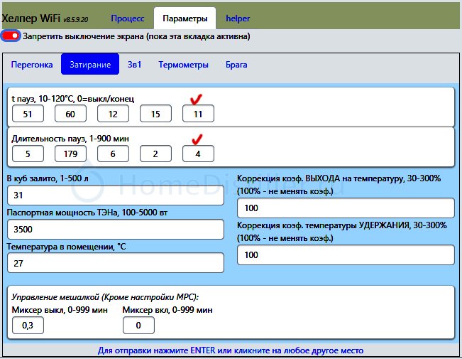 7. «Затирание» - автоматическое выполнение пяти температурных пауз с параметрами температуры и длительности пауз, приведёнными в разделе «Параметры», «Затирание». Можно использовать разгонный ТЭН большой мощности.